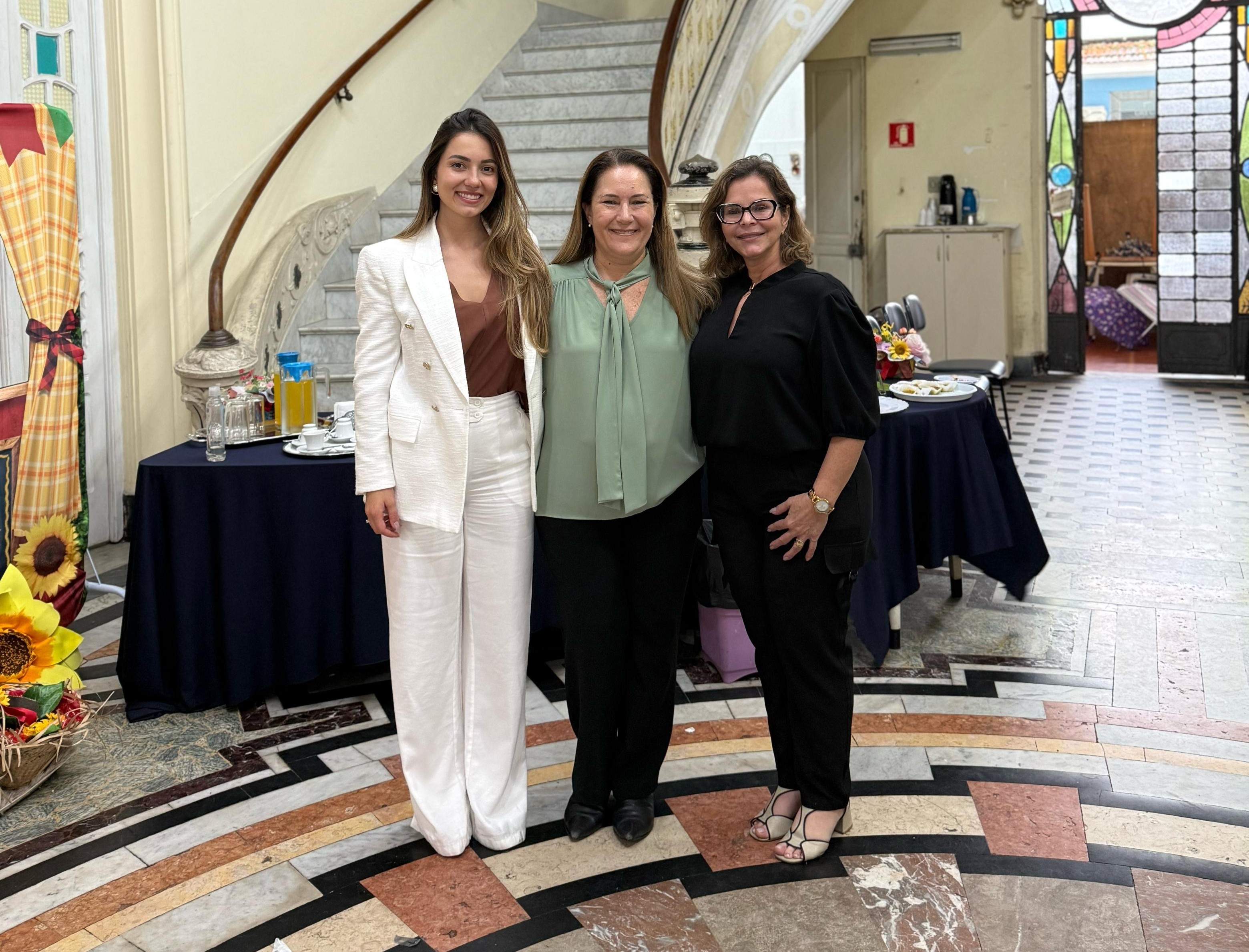 #ParaTodosVerem: Foto 1: Três mulheres posam sorrindo no centro de um salão com piso de mármore colorido e escadaria ao fundo. À esquerda está Taiana Prado, primeira-dama de São Sebastião, usando terno branco e blusa marrom. Ao centro está uma mulher com blusa verde-claro e, à direita, A Vereadora Maria Angela, de óculos, vestindo preto. Atrás delas, há uma mesa com toalha azul marinho, utensílios de café da manhã e sucos. O ambiente tem estilo clássico, com decoração delicada e vitral colorido na porta ao fundo. Foto 2: Três mulheres estão de pé diante de uma parede branca com a inscrição “Casa da Mulher em Santos” em letras rosa e roxo. Da esquerda para a direita: Taiana Prado, vestida de branco com blusa marrom; Nina Barbosa, secretária da Mulher de Santos, usando blusa verde; e Maria Angela, de óculos com roupa preta. As três estão sorrindo e posam lado a lado em ambiente interno moderno e bem iluminado. Foto 3: Seis pessoas posam em frente à escadaria de um salão interno. À esquerda, dois membros da equipe do Fundo Social de São Sebastião usam camisetas rosa com o logo do Fundo. No centro, Taiana Prado (de branco), uma mulher de blusa verde e outra de preto. À direita, um homem de terno escuro completa o grupo. O local possui piso de mármore claro e corrimão branco com detalhes entalhados.
