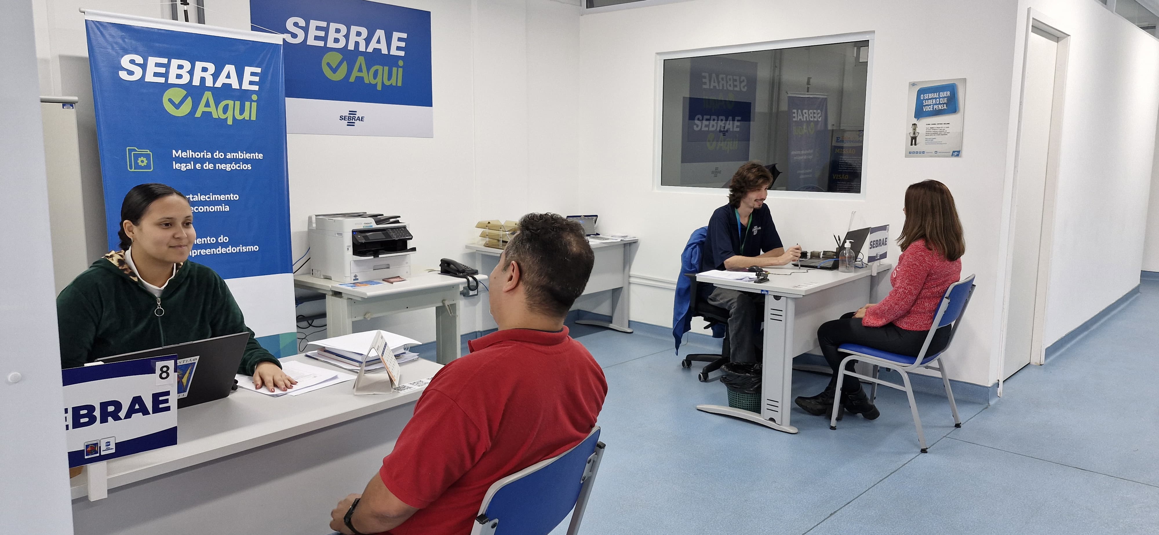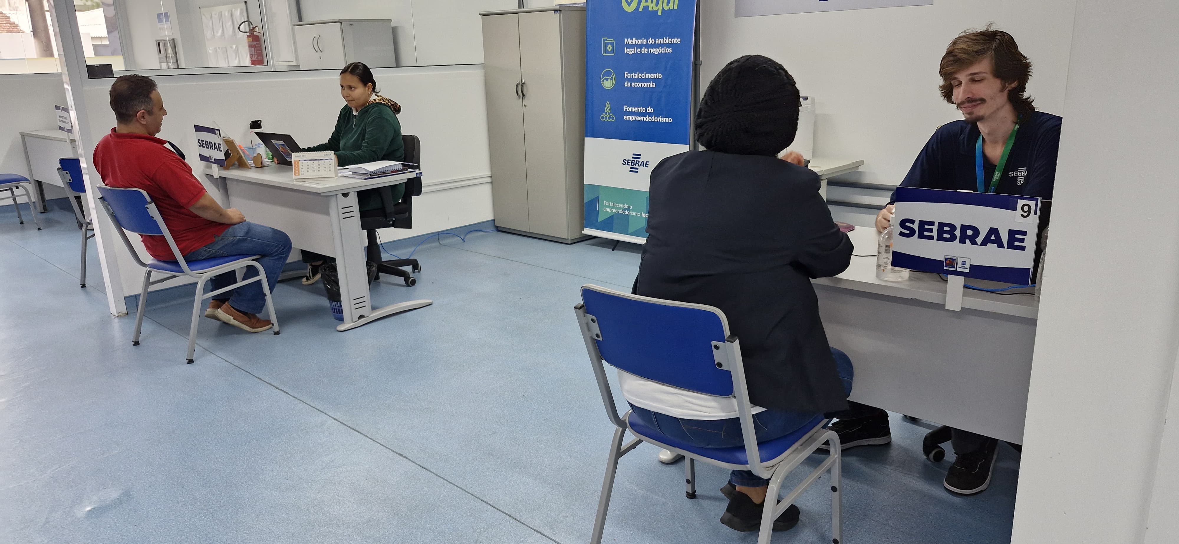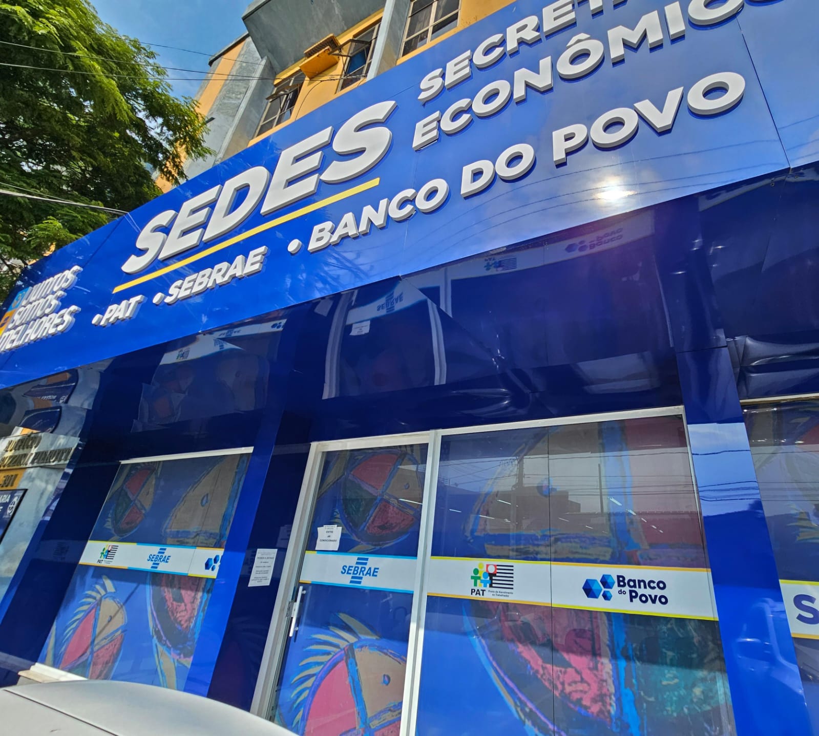 #PraTodosVerem: Quatro imagens ilustram o atendimento ao público na unidade da SEDES – Secretaria de Desenvolvimento Econômico. Na primeira imagem, fachada do prédio com revestimento azul e letreiro em letras grandes destacando os serviços oferecidos: SEDES, SEBRAE, PAT e Banco do Povo. As demais imagens mostram o interior da unidade, onde pessoas são atendidas em guichês individuais por profissionais identificados com placas do SEBRAE e do PAT. As salas são claras, com piso azul claro, cadeiras azuis e ambiente organizado. Os atendimentos envolvem conversas e uso de computador, demonstrando orientação e suporte ao empreendedorismo e à busca por oportunidades de trabalho. Fim da descrição.