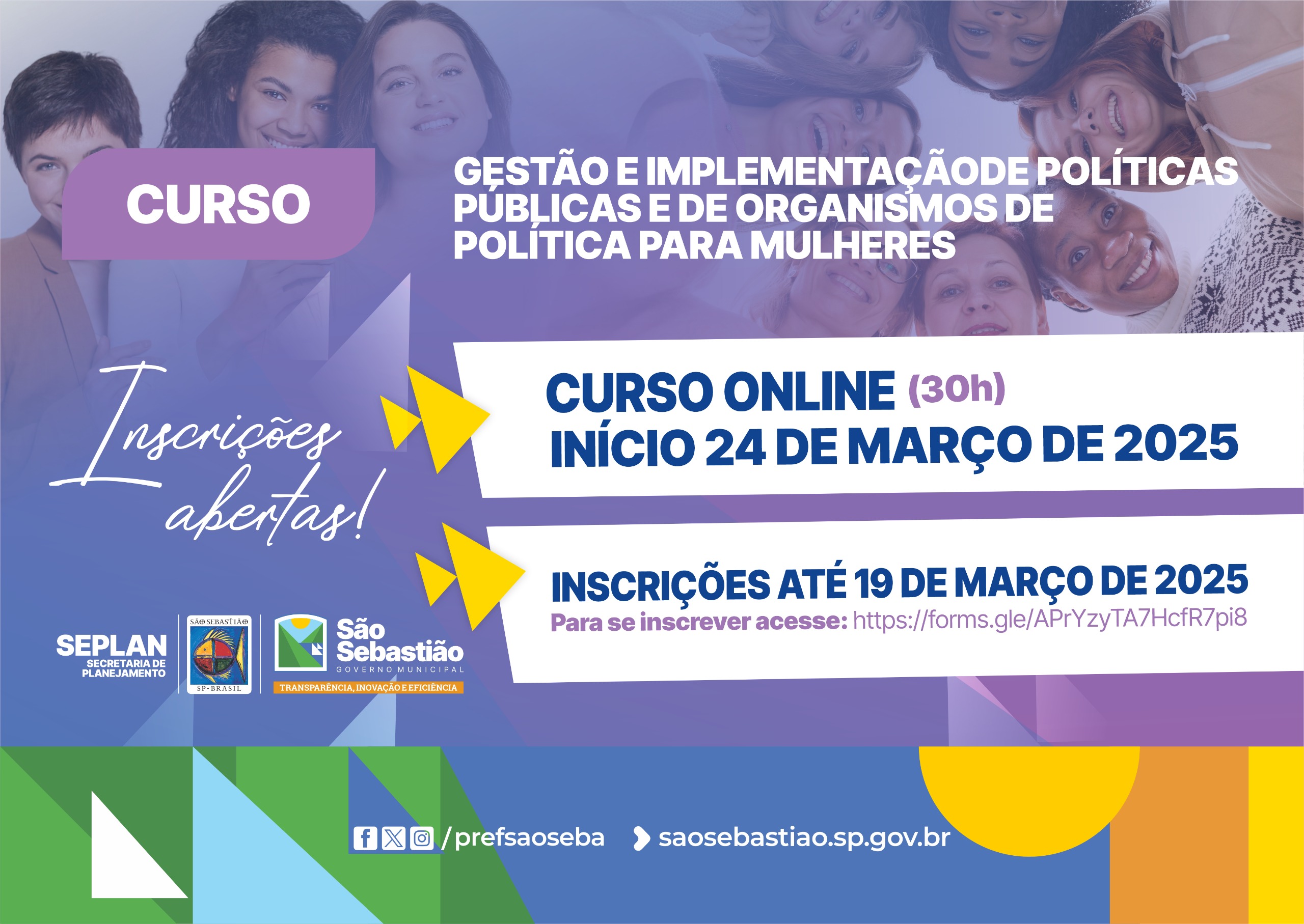A Prefeitura de São Sebastião, por meio da Secretaria de Planejamento (Seplan), está com inscrições abertas para o curso “Gestão e Implementação de Políticas Públicas e de Organismos de Políticas para Mulheres”, oferecido pela Escola de Governo e Gestão, em parceria com a Escola Virtual de Governo (EV.G).