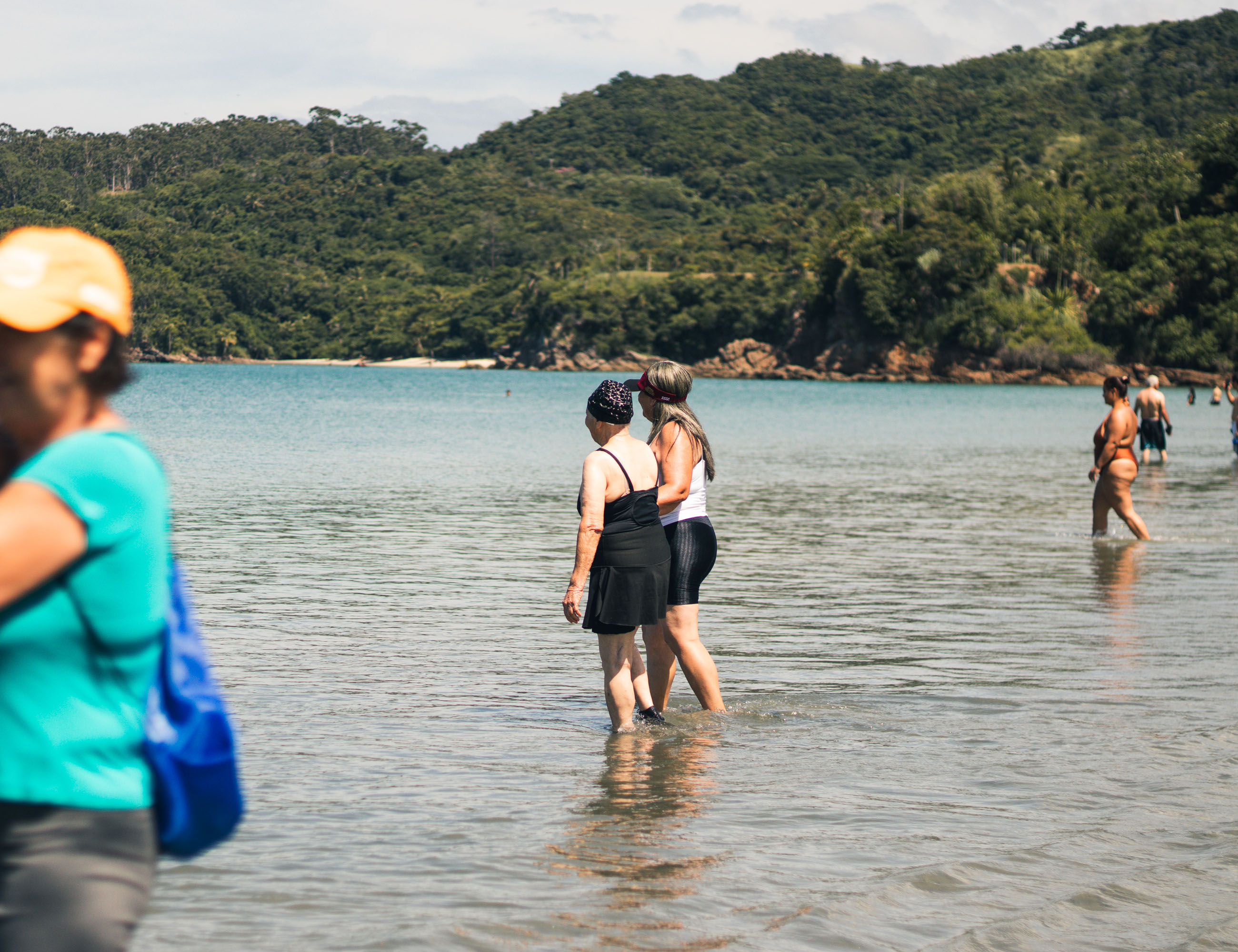 #PraTodosVerem: imagem de um grupo de mulheres entrando no mar durante a vivência, mais uma imagem de três mulheres idosas em um momento de relaxamento em baixo da copa de uma árvore, a terceira imagem retrata uma senhora ao ar livre desfrutando de momento de lazer durante o encontro e a última imagem de mais um grupo de mulheres reunidas na praia durante a vivência. Fim da descrição.