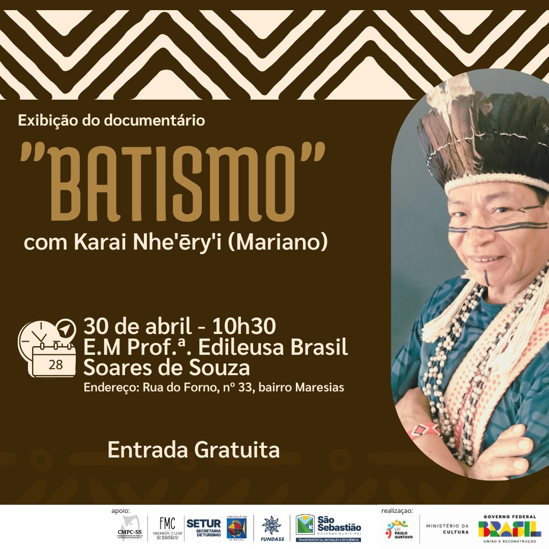 Complementando o projeto, no dia 30 de abril, às 10h30, na EM Prof.ª Edileusa Brasil Soares de Souza, será exibido o documentário ‘Batismo’. O trabalho produzido pelo indígena Karai Nhe'ēry'i (Mariano) propõe informar sobre o ritual tradicional do batismo que faz parte da cultura e da espiritualidade dos povos Tupi-Guarani.