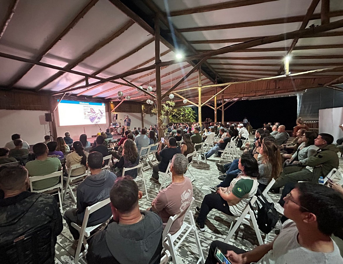 #PraTodosVerem: Foto da oficina de boas práticas para observação de baleias jubarte e outros cetáceos de 2025, realizada em um espaço coberto de madeira, com estrutura rústica. O ambiente está cheio, com dezenas de pessoas sentadas em cadeiras brancas, organizadas em fileiras e voltadas para a frente. Um palestrante apresenta um conteúdo projetado em uma tela grande. Fim da descrição.