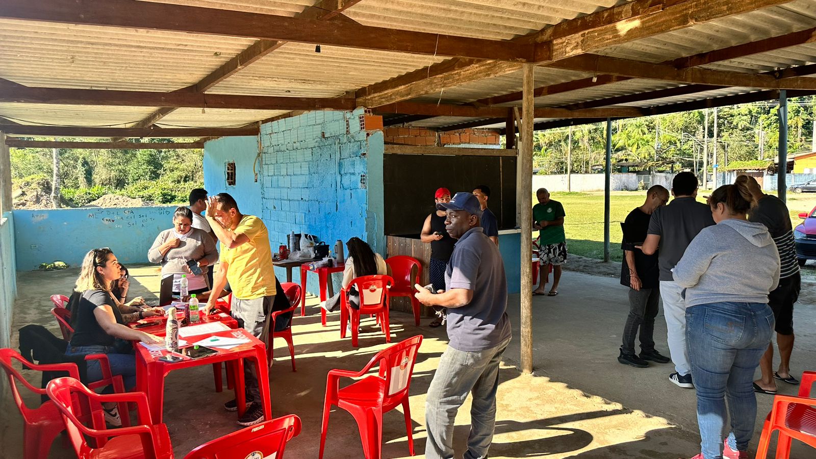 #PraTodosVerem: as imagens mostram uma ação social ocorrendo em uma área coberta, com paredes de alvenaria azul-clara e cadeiras vermelhas de plástico. Em diferentes ângulos, vemos pessoas sentadas em mesas sendo atendidas por profissionais com crachá, utilizando cadernos, papéis e computadores. Algumas pessoas estão em pé, aguardando atendimento ou conversando. O ambiente é simples, com iluminação natural, e ao fundo há vegetação e um campo aberto. A ação demonstra um atendimento comunitário voltado ao acolhimento e suporte da população local. Fim da descrição.