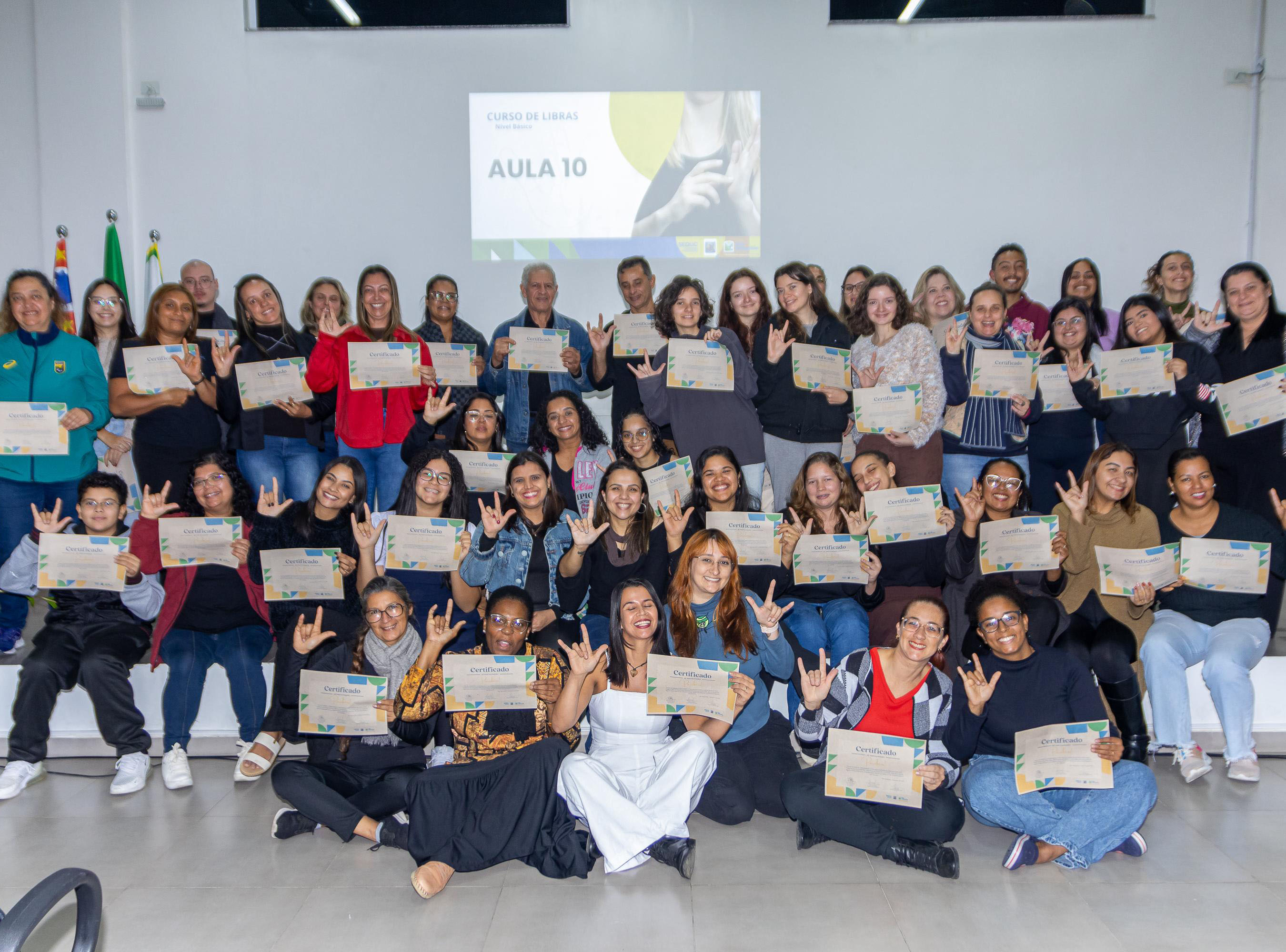 #PraTodosVerem: Registros do curso de Libras em São Sebastião. Participantes em sala interagem com a professora, praticam sinais e, ao final, posam em grupo com certificados e o gesto de “eu te amo” em Libras. Fim da descrição.