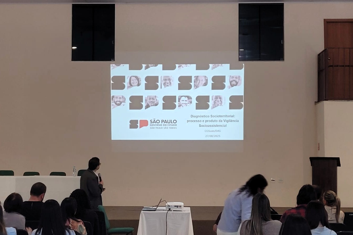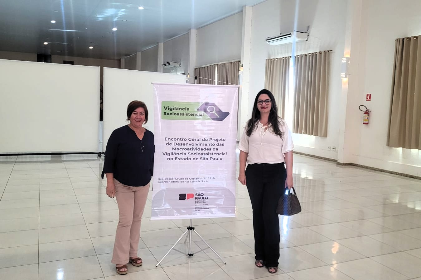 #PraTodosVerem As imagens mostram momentos do Encontro Geral do Projeto Estadual de Desenvolvimento das Macroatividades da Vigilância Socioassistencial, realizado em São Paulo, com a presença de profissionais e gestores da área. Em uma das fotos, participantes acompanham atentamente a apresentação de um palestrante em auditório, enquanto na outra duas representantes posam ao lado do banner oficial do evento, que destaca a importância da iniciativa. Fim da descrição.