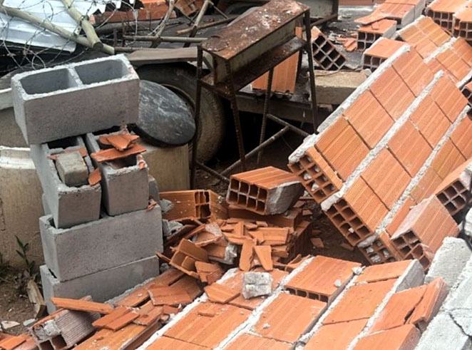 #PraTodosVerem: As imagens mostram diferentes aspectos de uma operação em andamento. A primeira imagem mostra uma cena com carros da polícia, com policiais presentes, sugerindo a realização de alguma ação de segurança pública, provavelmente em apoio à operação de desmonte ou fiscalização da área. O ambiente ao fundo indica que a operação está sendo realizada em uma área rural ou suburbana., . A segunda imagem revela pilhas de materiais de construção, como blocos de concreto e tijolos. A terceira foto mostra que trabalhadores estão na área onde havia uma construção considerada irregular. Fim da descrição.