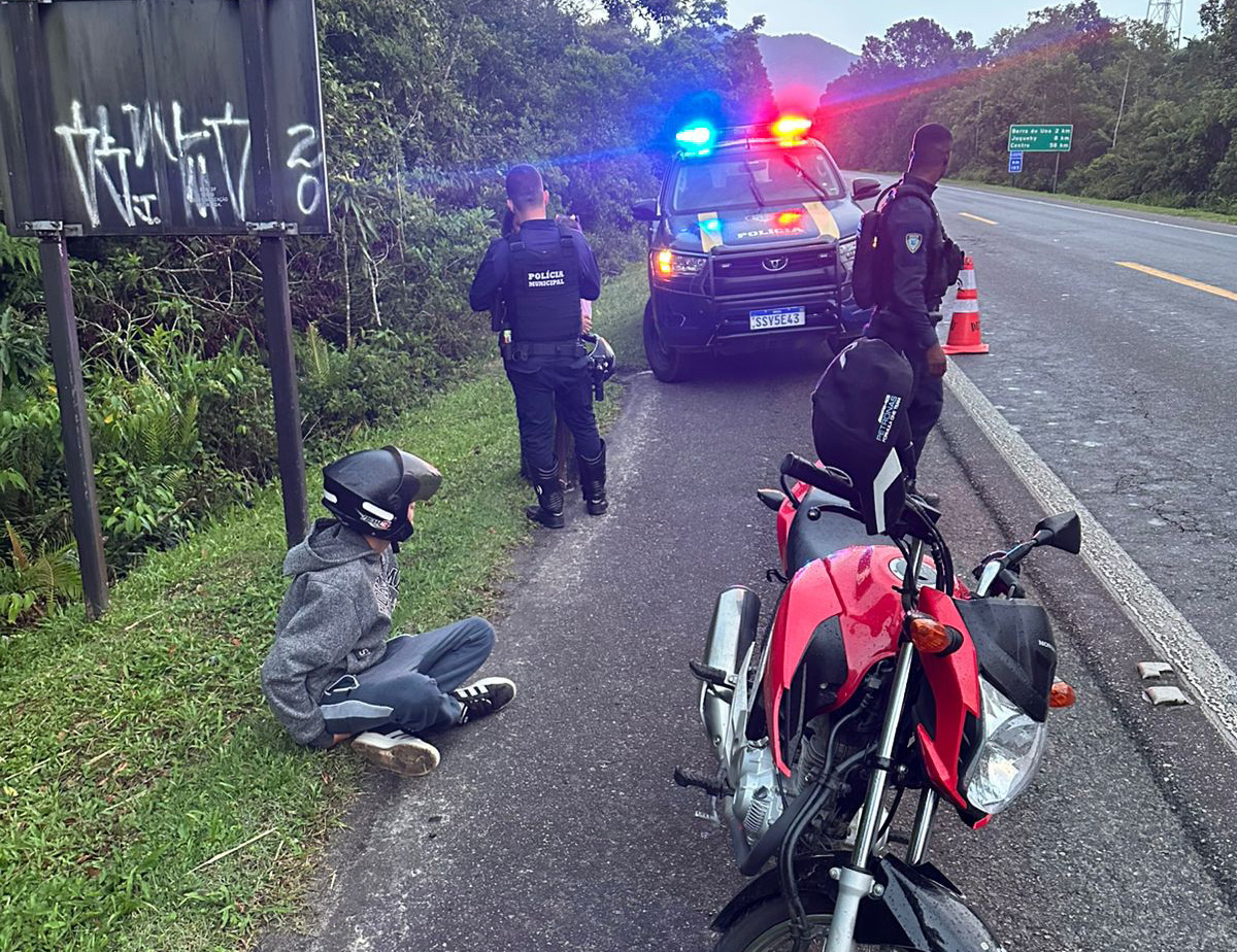 Durante patrulhamento ostensivo e preventivo realizado no final de semana pela Rua Antônio Mateus Bitencourt, no bairro Barra do Una, da Costa Sul, a Polícia Municipal de São Sebastião avistou uma motocicleta Honda/CG 160 Fan sem placa de identificação, conduzida por um rapaz e com outras duas pessoas, sendo uma delas uma criança.
