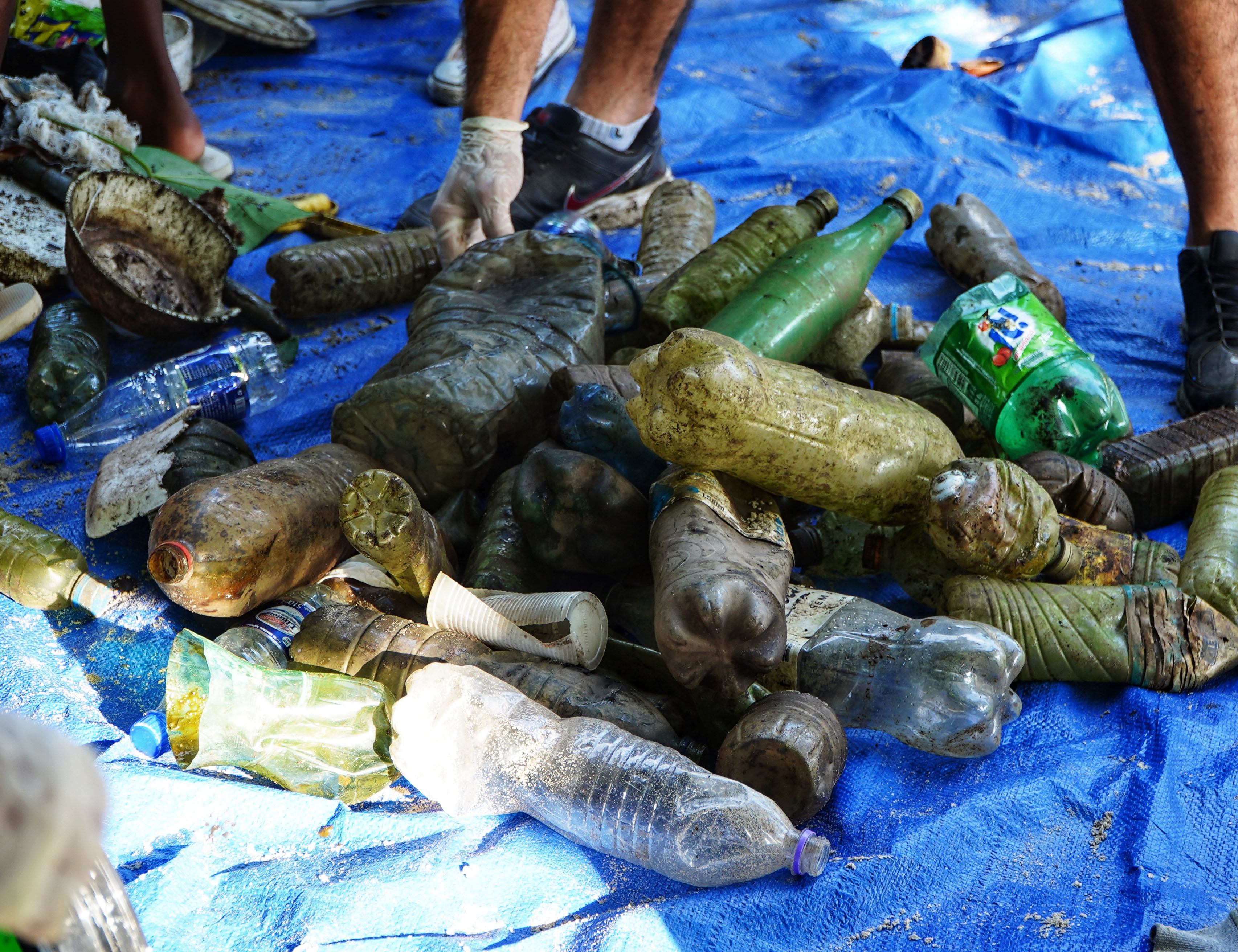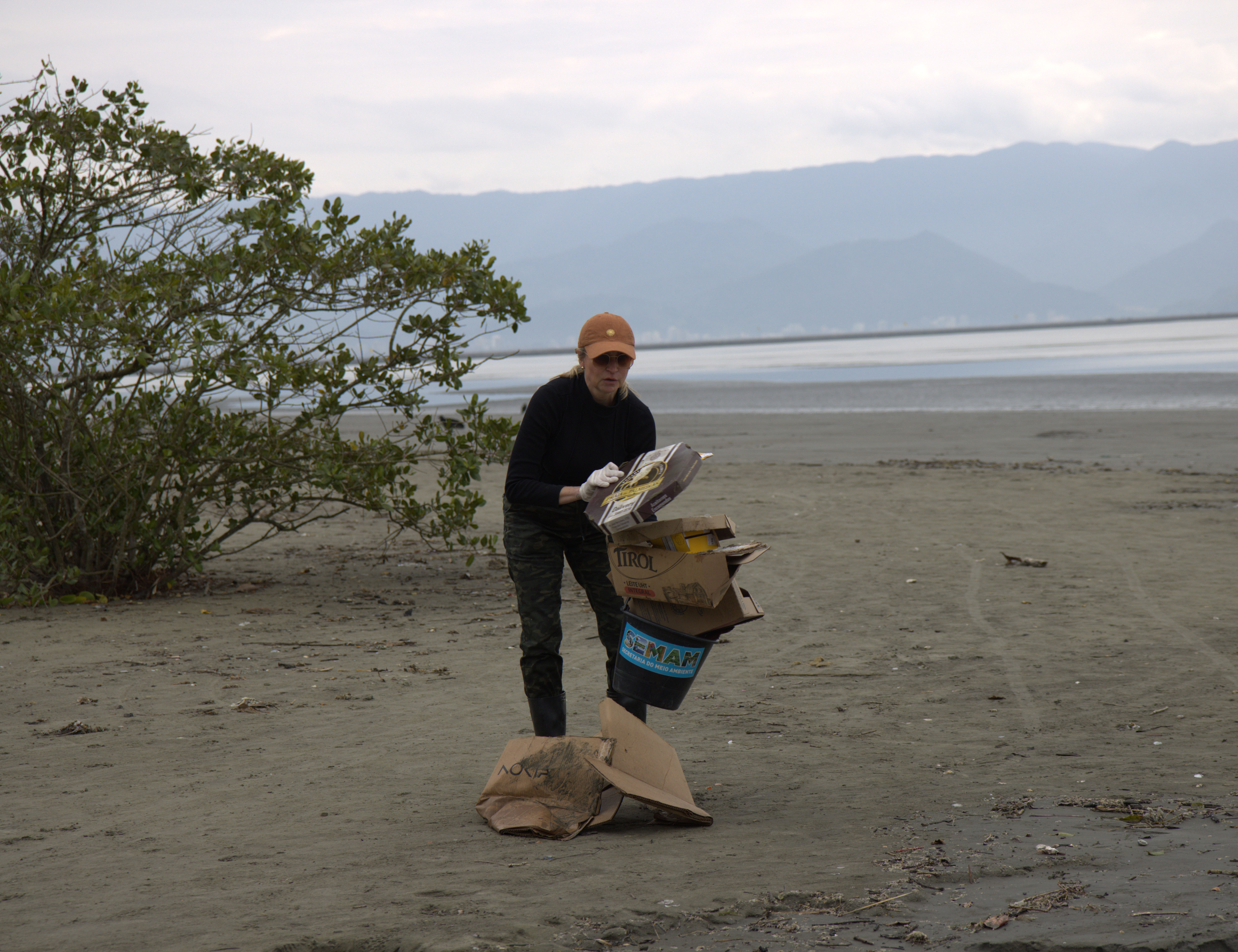 #PraTodosVerem: As imagens registram uma ação de limpeza em área de manguezal. Na primeira, uma criança deposita resíduos em um saco. Na segunda, uma mulher reúne caixas de papelão para retirada. Na terceira, aparecem diversas garrafas plásticas recolhidas durante uma limpeza. Fim da descrição
