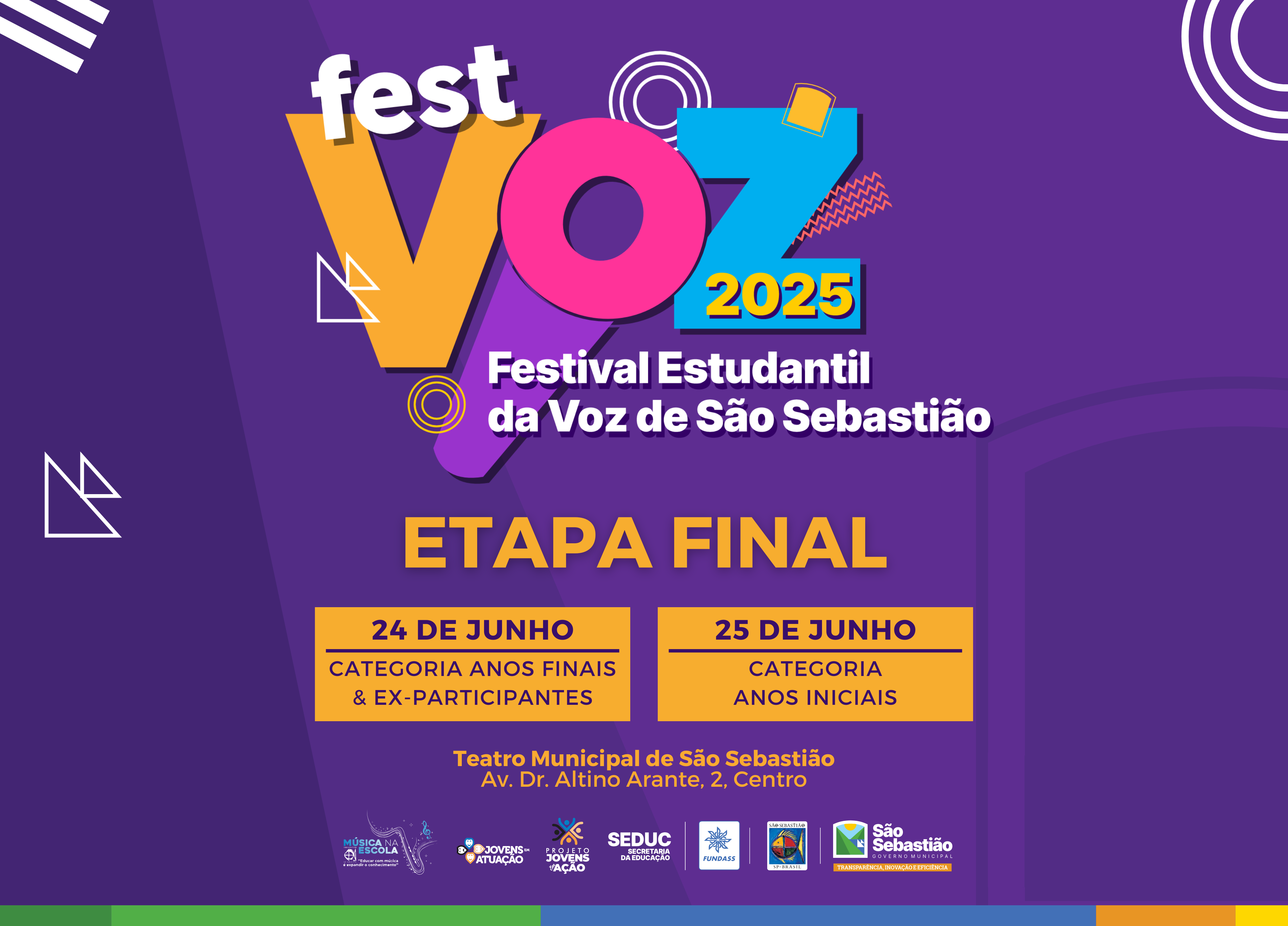 Com o objetivo de valorizar os talentos musicais de alunos da rede municipal de ensino, a Prefeitura de São Sebastião, por meio da Secretaria da Educação (Seduc), realiza nos dias 24 e 25 de junho, às 10h, no Teatro Municipal, a grande final e cerimônia de premiação do Festival Estudantil da Voz – FestVoz 2025.