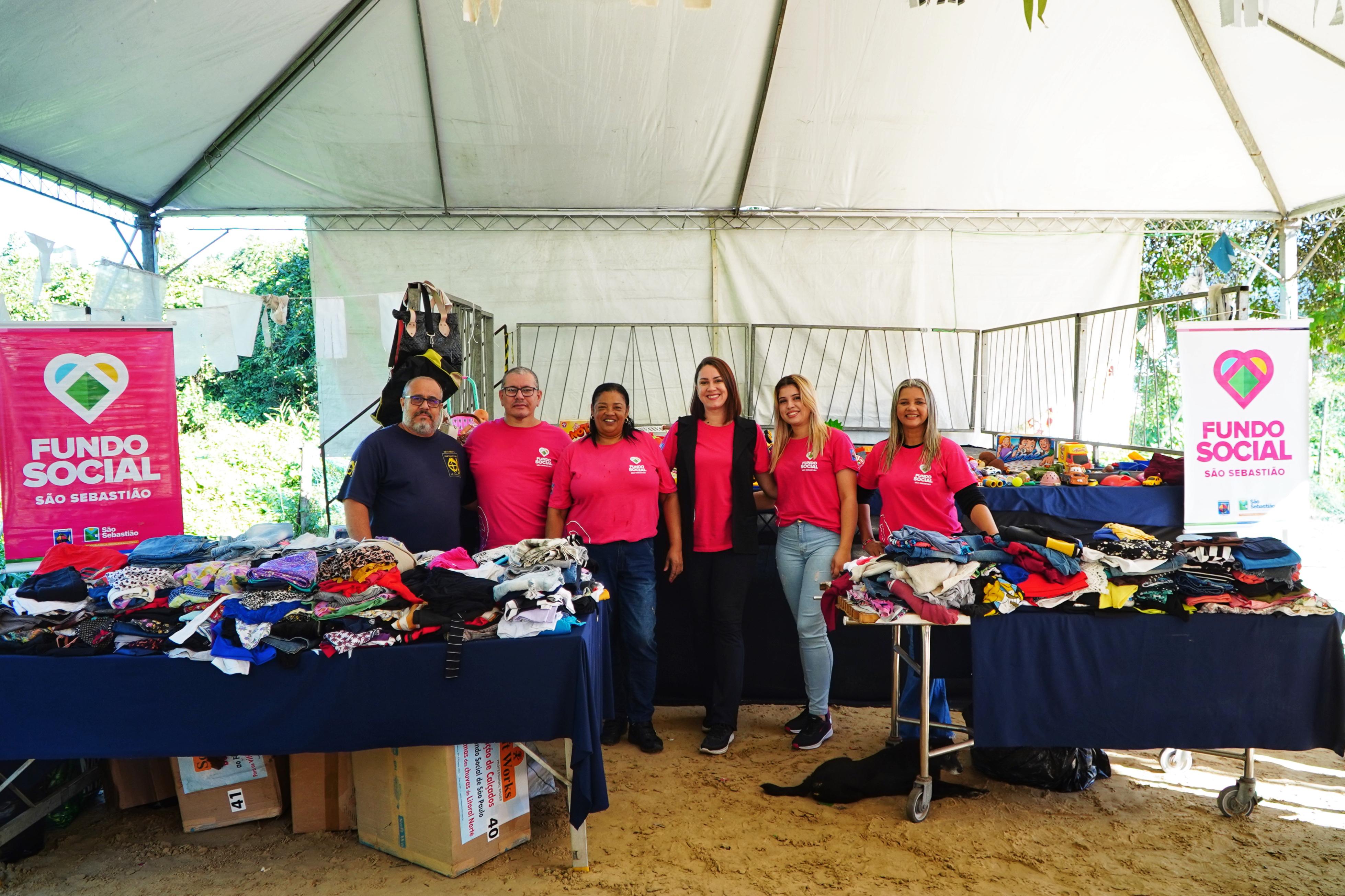 #ParaTodosVerem: Imagem 1: Sob uma tenda branca, várias mulheres estão de costas, escolhendo roupas em um varal com cabides. Elas olham atentamente as peças disponíveis, com destaque para uma mulher de chapéu de palha e outra com uma blusa verde estampada. Ao fundo, há uma placa com o logotipo do Fundo Social de São Sebastião. Imagem 2: Exposição organizada de brinquedos e roupas sob uma tenda. A parte superior da mesa está repleta de brinquedos coloridos, como bonecas, carrinhos e jogos. Na parte inferior, pilhas de roupas dobradas em diversas cores. À direita da imagem, há uma placa com o logotipo do Fundo Social de São Sebastião. Imagem 3: Seis pessoas estão alinhadas atrás de uma mesa coberta com roupas dobradas, sob uma tenda. Todos vestem camisetas rosa do Fundo Social, com exceção de um homem com camiseta azul escura. À esquerda e à direita da imagem, banners do Fundo Social de São Sebastião. Um cachorro preto está deitado no chão, parcialmente visível sob a mesa à frente. Fim da descrição.