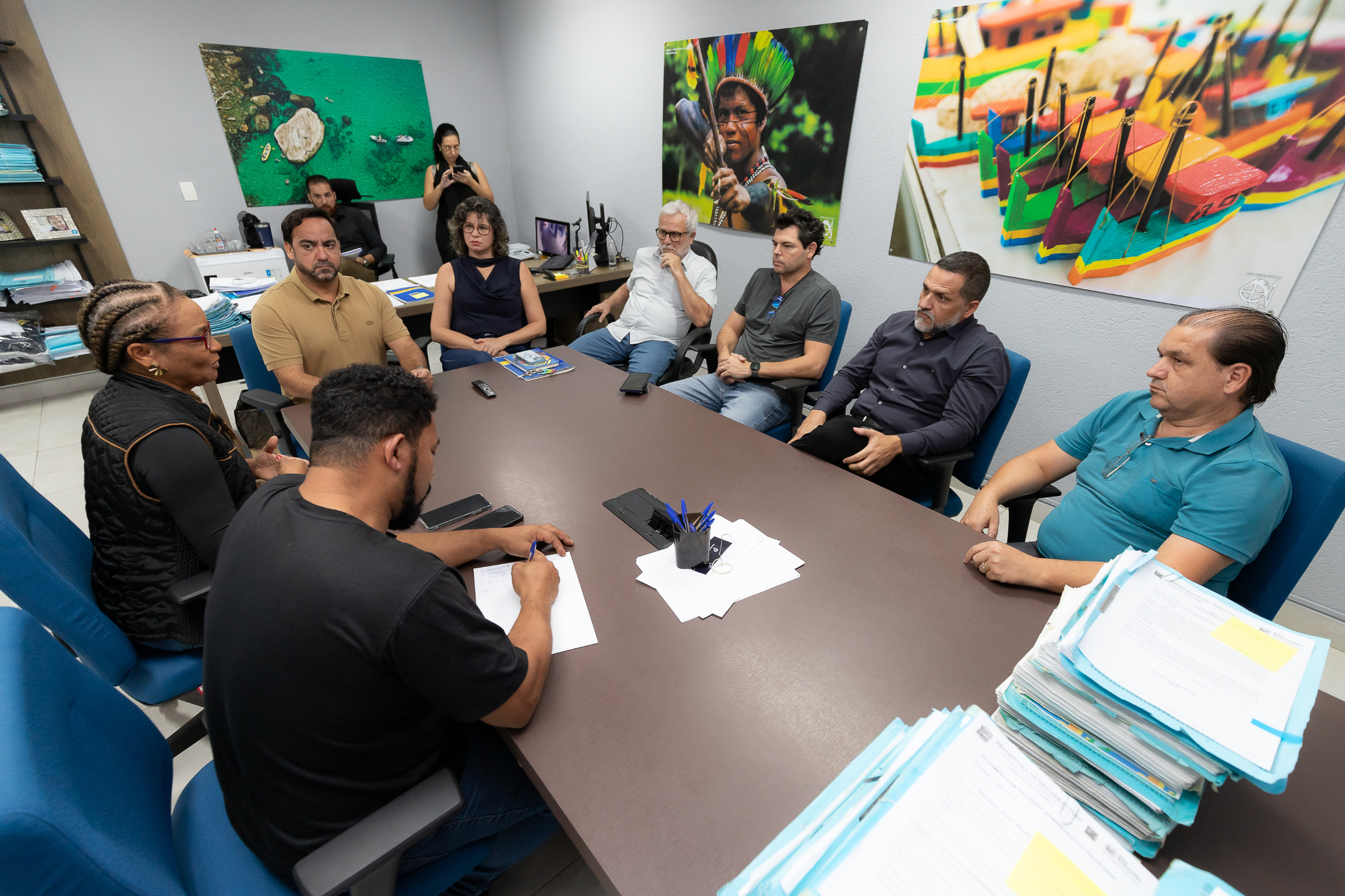 #PraTodosVerem : Na primeira imagem, nove pessoas estão sentadas ao redor de uma mesa retangular marrom, participando de uma reunião. À esquerda, uma mulher fala, enquanto um homem ao seu lado escreve em um caderno. As demais pessoas escutam atentamente. No fundo da sala, há quadros coloridos na parede e uma mulher em pé usando o celular. Na segunda imagem, dezenas de pessoas estão reunidas em um salão amplo, de costas para a câmera, com os braços erguidos. A maioria veste roupas casuais. Fim da descrição.