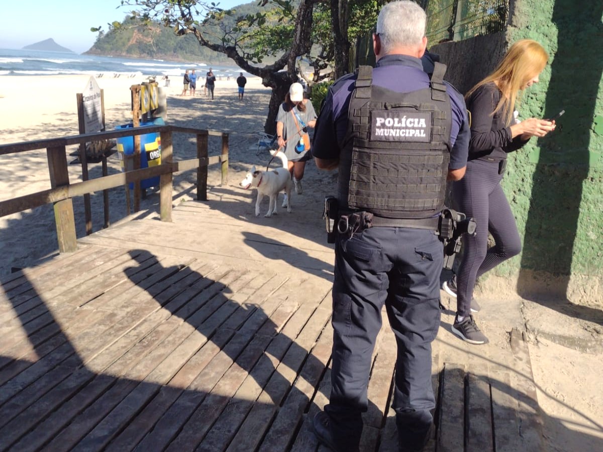 #PraTodosVerem: Duas imagens mostram ações de fiscalização em uma praia. Na primeira, um agente da Polícia Municipal conversa com uma mulher, enquanto outras pessoas caminham pela entrada da praia com cachorros. Ao fundo, há o mar, faixa de areia e um morro. Na segunda imagem, um grupo de pessoas, incluindo guardas municipais e representantes de um projeto ambiental, está posicionado sob a sombra de árvores na areia, ao lado de uma barraca. Todos olham para a câmera. Fim da descrição.