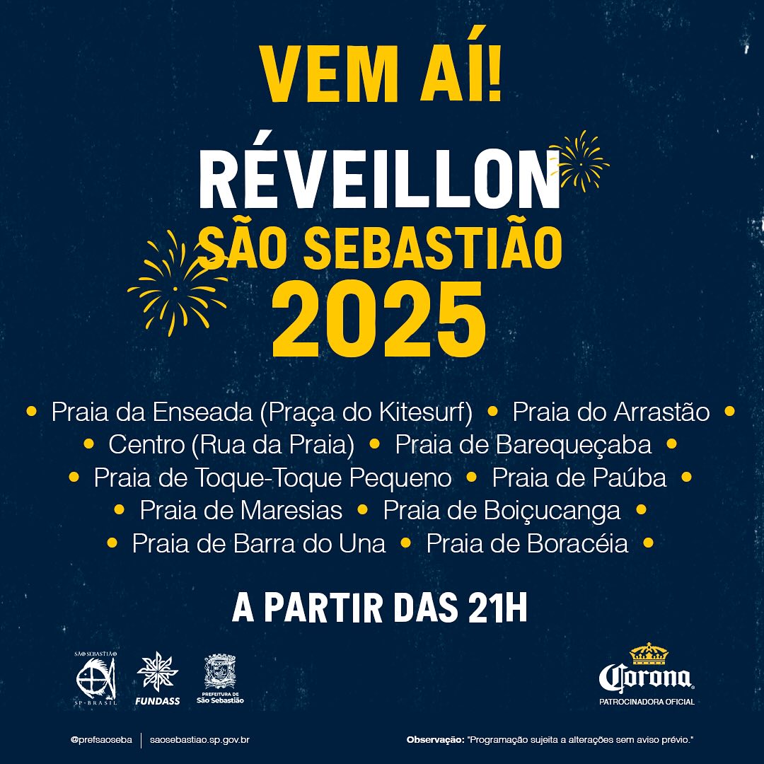 Os moradores e visitantes terão a oportunidade de dar as boas-vindas a 2025 em grande estilo, à beira-mar, com o tradicional show pirotécnico (sem estampidos) e apresentações de DJs, das 21h do dia 31 de dezembro de 2024, até às 2h do dia 1° de janeiro de 2025. A festa ocorrerá em pontos estratégicos, incluindo os bairros Enseada (Praça do Kitesurf), Arrastão, Centro (Rua da Praia), Barequeçaba, Toque-Toque Pequeno, Paúba, Maresias, Boiçucanga, Barra do Una e Boraceia.