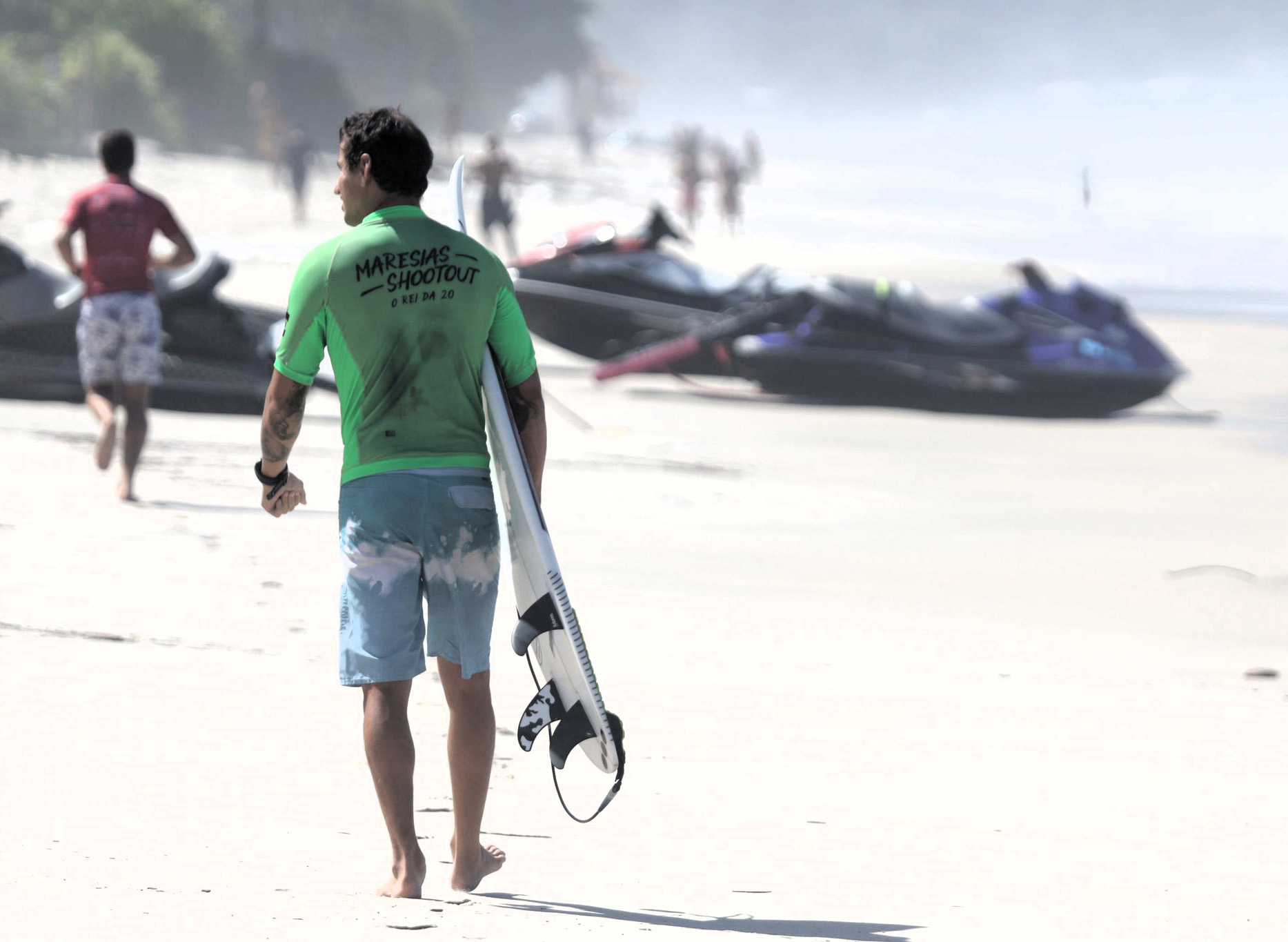 #PraTodosVerem: Em uma das cenas, um surfista com camiseta verde executa uma manobra potente no topo da onda, lançando água para o alto enquanto mantém total controle da prancha; em outra, dois competidores aguardam na beira do mar com suas pranchas em mãos, observando as séries que se aproximam; e, por fim, um atleta caminha pela areia vestindo a lycra verde do Maresias Shootout, carregando sua prancha em direção ao mar com jet skis ao fundo, compondo o clima de competição intensa do evento. Fim da descrição.