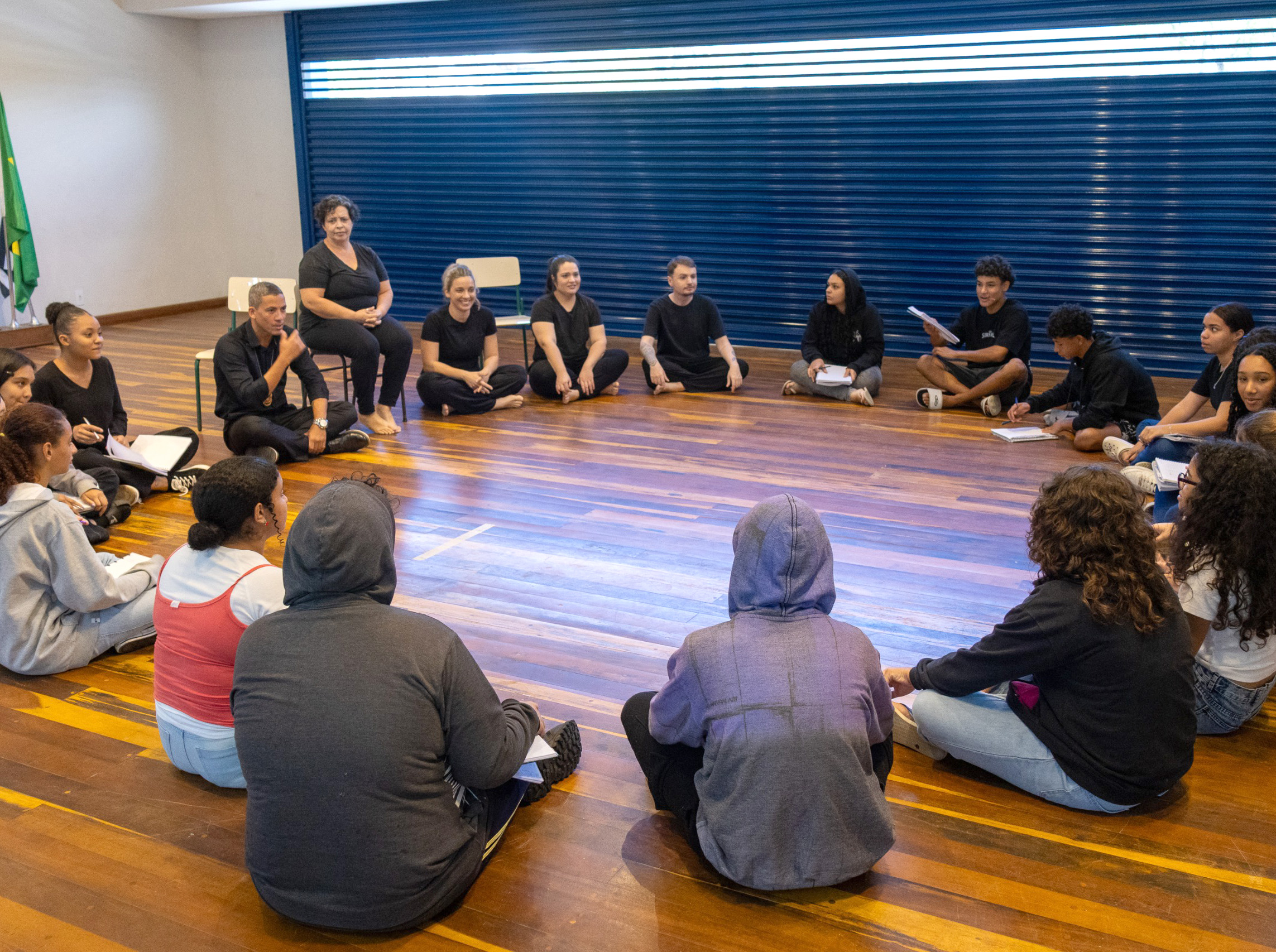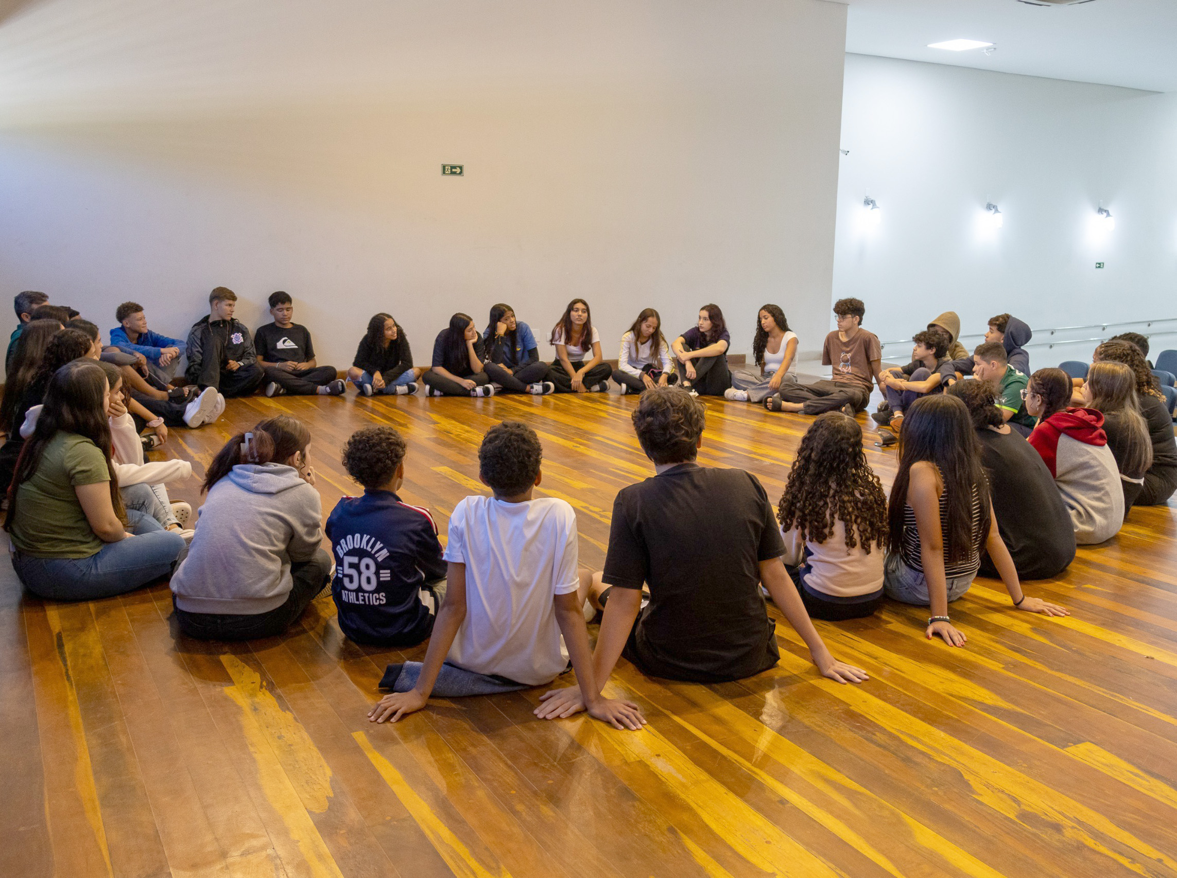 #PraTodosVerem: Três imagens de jovens e adolescentes participando de um fórum ou atividade de grupo. A primeira foto mostra um grupo grande de adolescentes sentados em cadeiras de auditório, prestando atenção em algo à frente. A segunda e a terceira imagens mostram grupos de jovens e adolescentes, alguns em uniformes escolares, sentados em círculo no chão de madeira, em um ambiente de sala de aula ou sala de reunião, participando de discussões em grupo. No círculo, alguns jovens leem papéis e em uma das fotos, há adultos sentados com os jovens, facilitando a atividade. O foco é na participação e engajamento dos jovens nas dinâmicas de grupo. Fim da descrição.