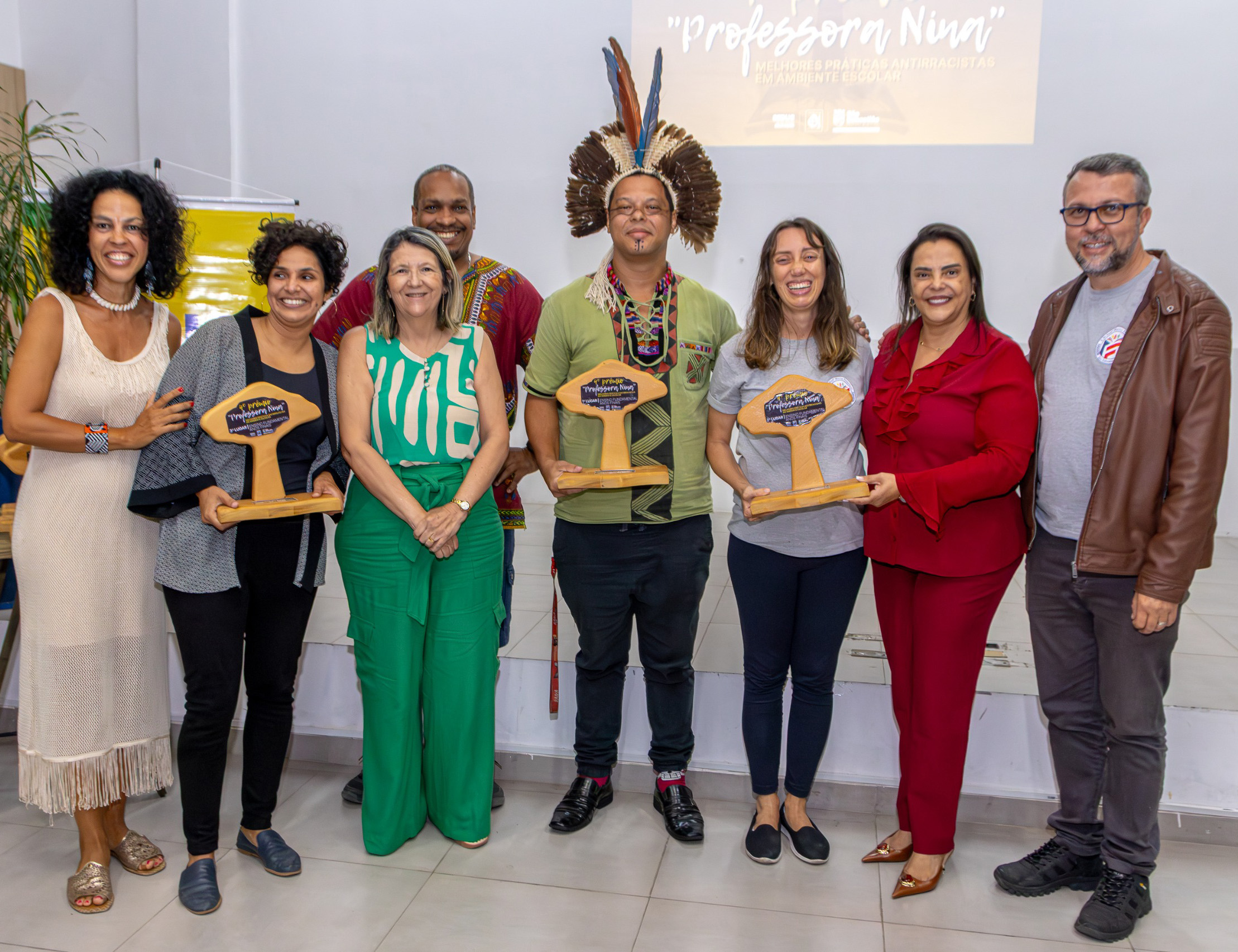 #PraTodosVerem: As fotos registram a cerimônia do 4º Prêmio “Professora Nina”, que reconhece práticas antirracistas nas escolas. Um grande grupo de educadores posa junto para a foto oficial, segurando certificados e troféus em formato de árvore. Há também imagens dos troféus sobre a mesa, uma apresentação de dança no palco e a entrega dos prêmios aos vencedores, com participantes sorrindo e celebrando. Fim da descrição.