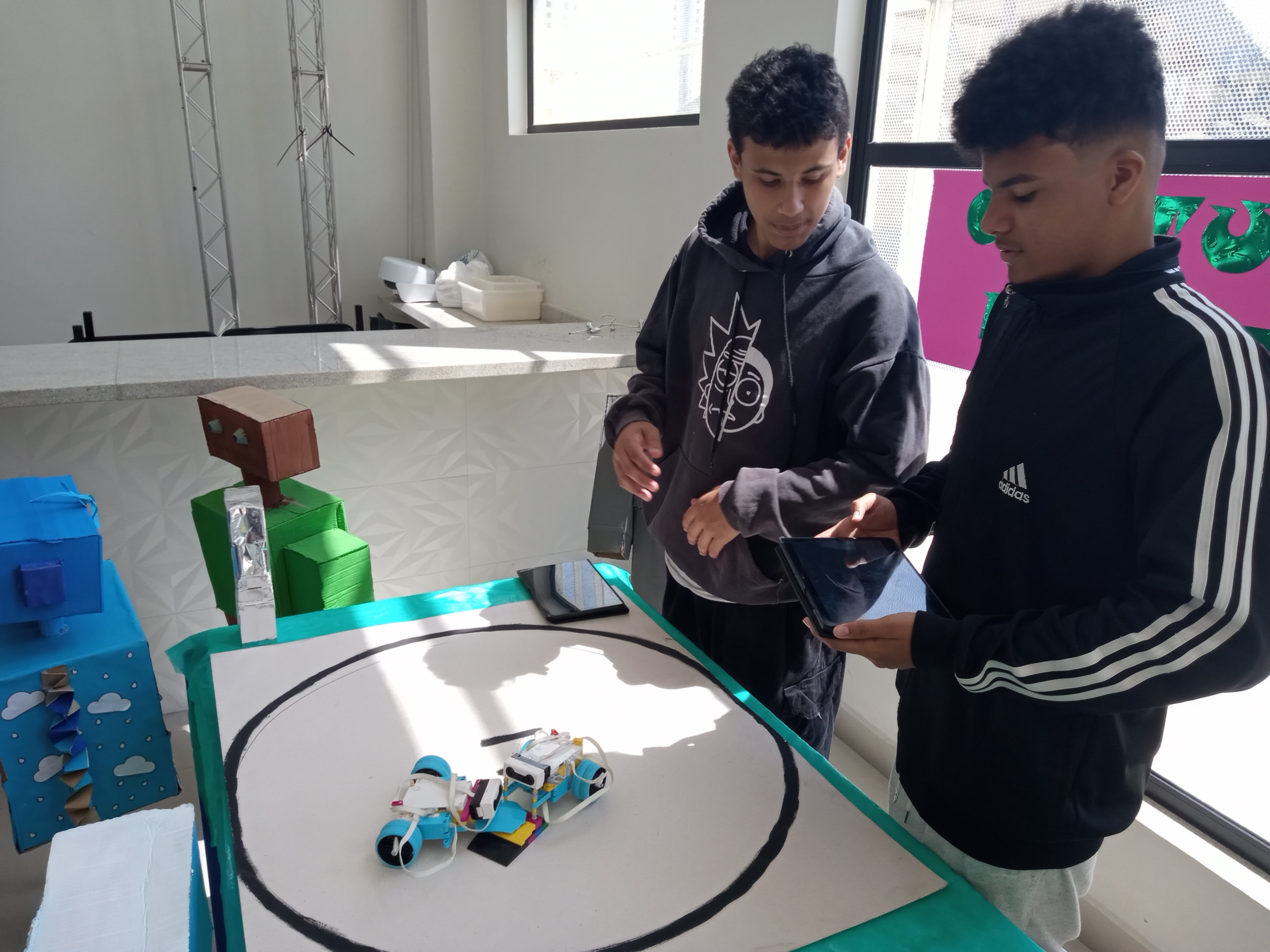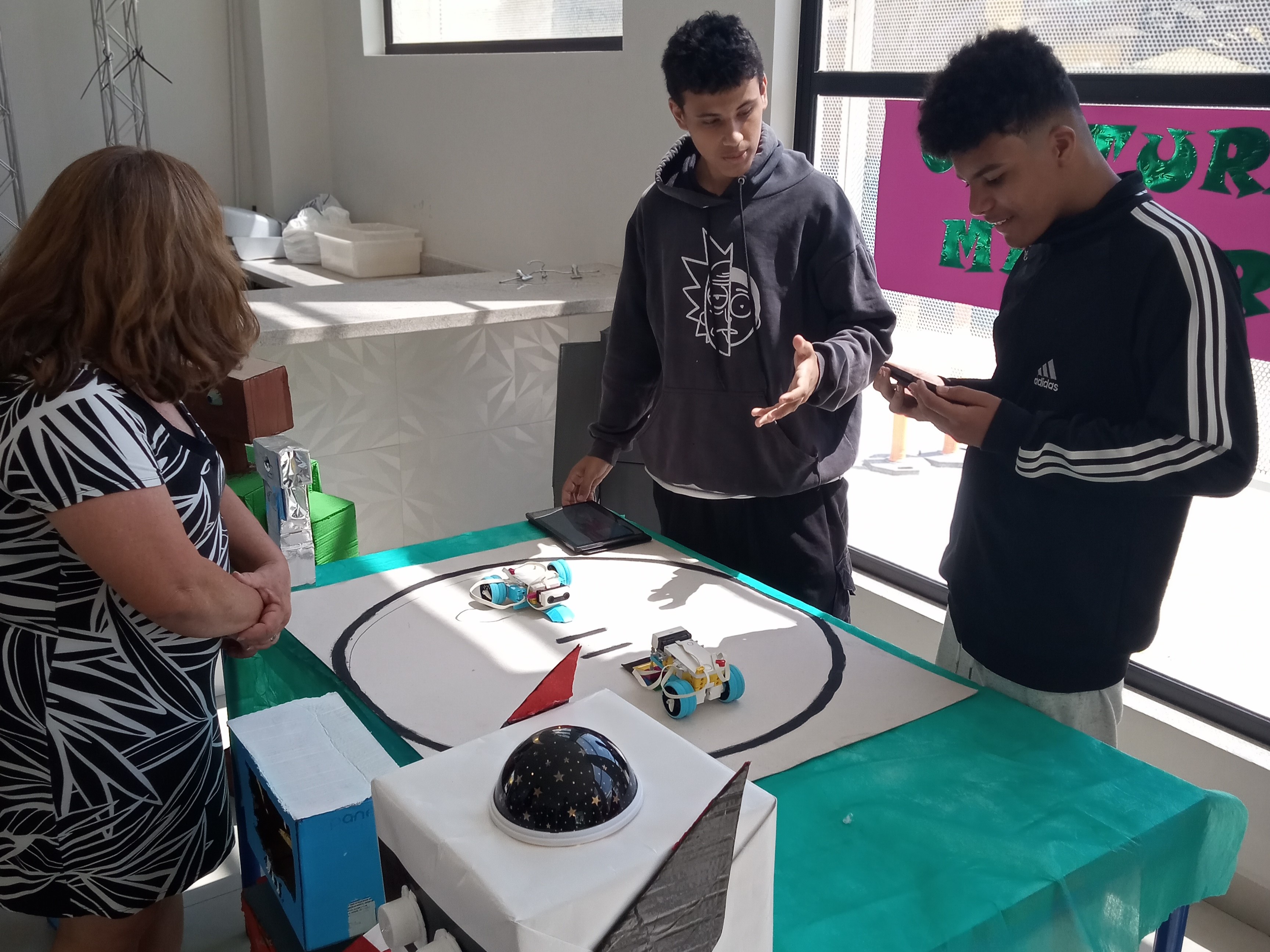 Na EM Cynthia Cliquet Luciano, durante a ExpoTec, no stand da cultura maker, alunos do 8º ano B, ganhadores do campeonato de robô sumô realizado na unidade, foram os responsáveis para apresentar ao público como funciona a disputa, e o que pode interferir na batalha no momento de elaboração e programação dos protótipos.