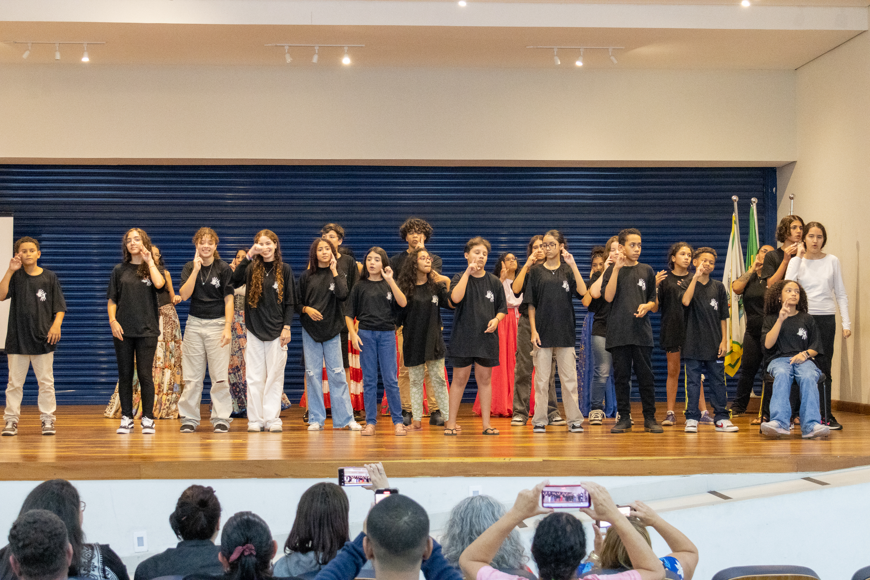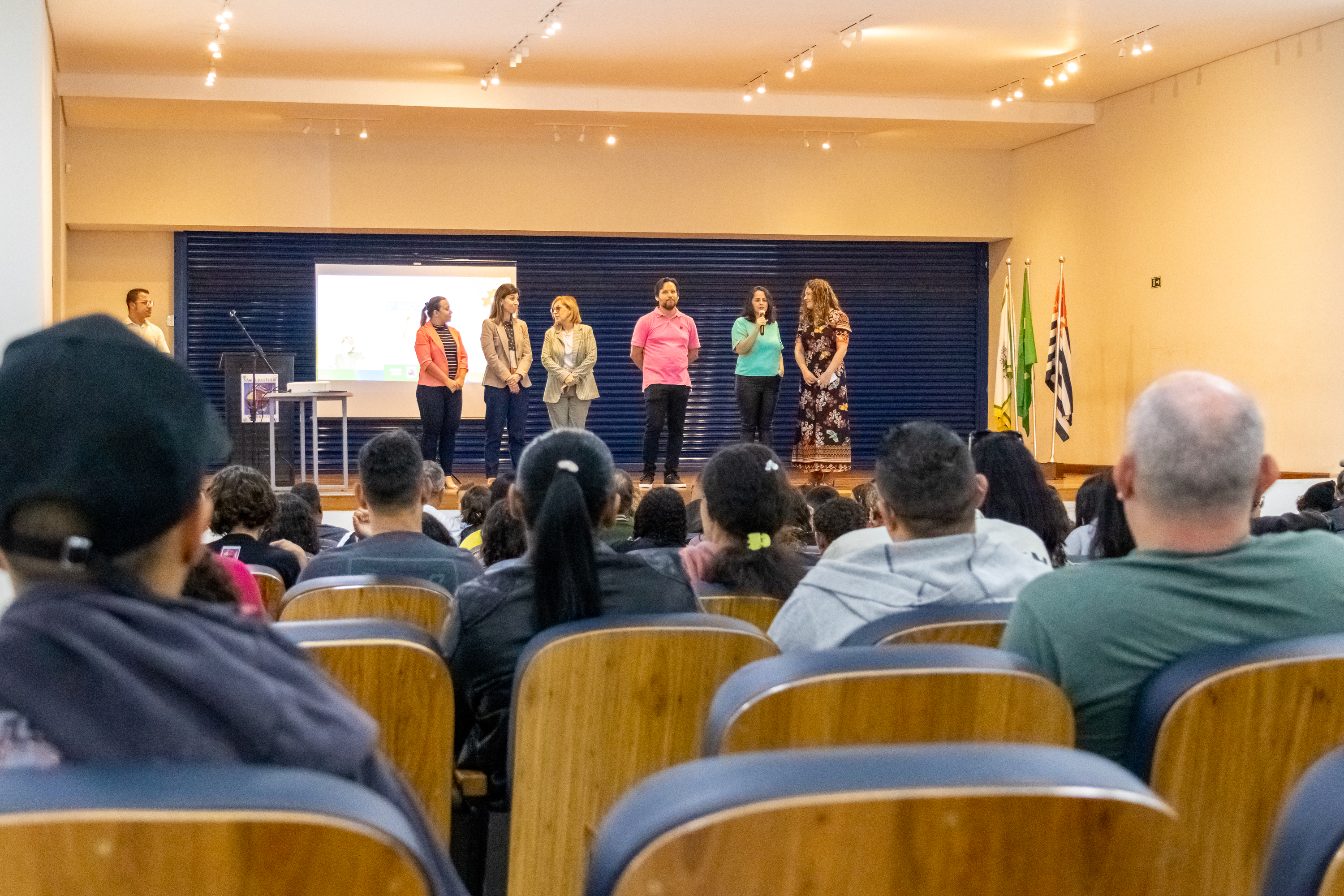 #PraTodosVerem: em um auditório, estudantes se apresentam em Libras no palco, organizados em fila e vestidos com camisetas pretas, enquanto a plateia formada por familiares e comunidade escolar acompanha atenta, aplaude e registra o momento com celulares. Em outro momento, seis pessoas sobem ao palco, falam ao microfone diante do público e de um telão com projeção, acompanhadas das bandeiras do Brasil, de São Paulo e de São Sebastião. Já no espaço de convivência, familiares, alunos e convidados circulam pela exposição ‘Do EAPE para o mundo’, observando painéis com fotos e histórias de ex-alunos, interagindo, posando para fotos e apreciando a mostra. Fim da descrição.