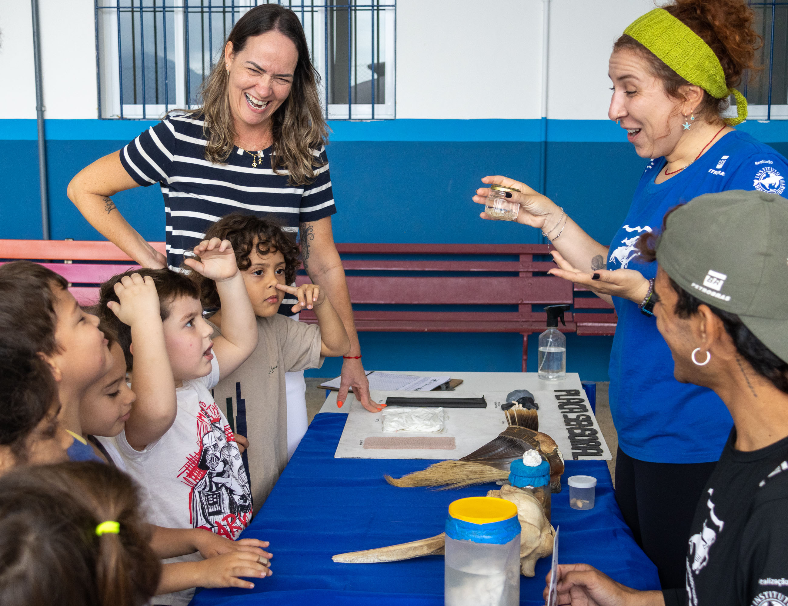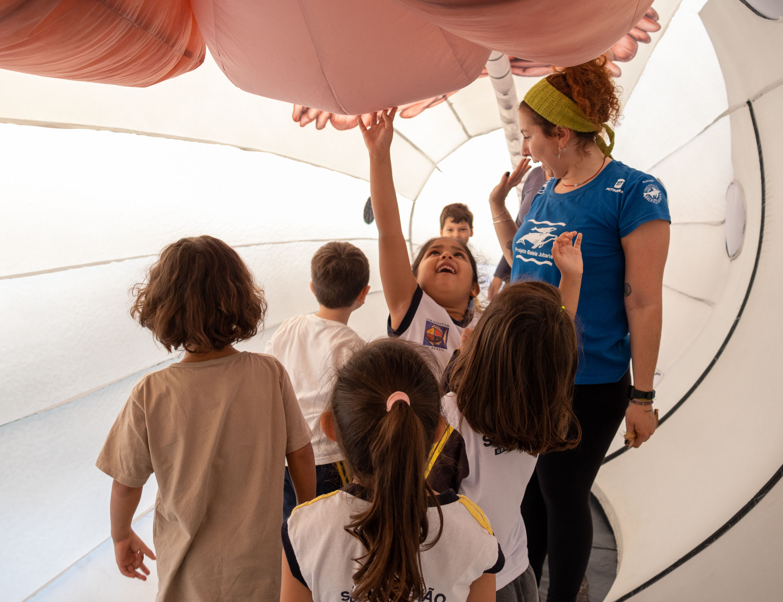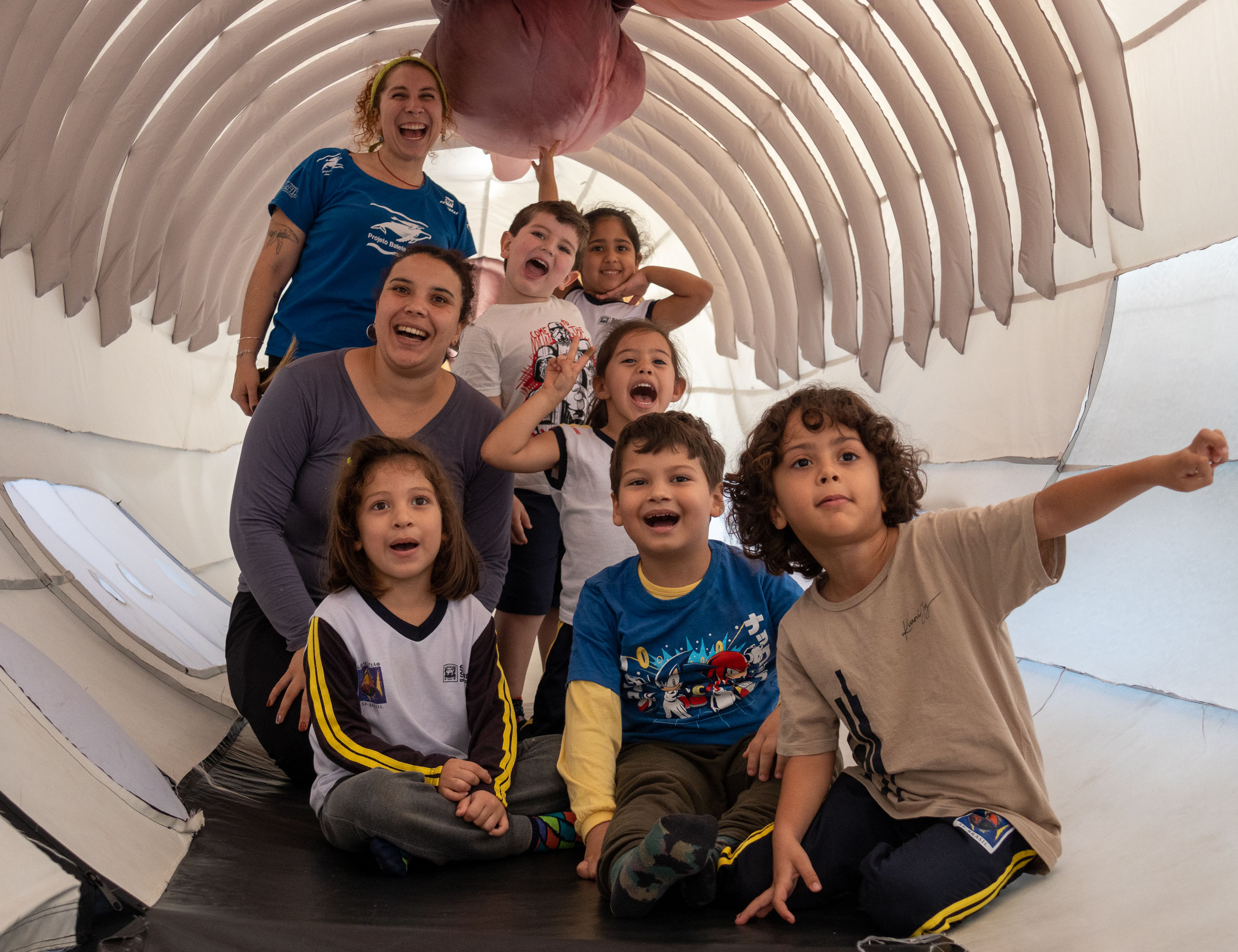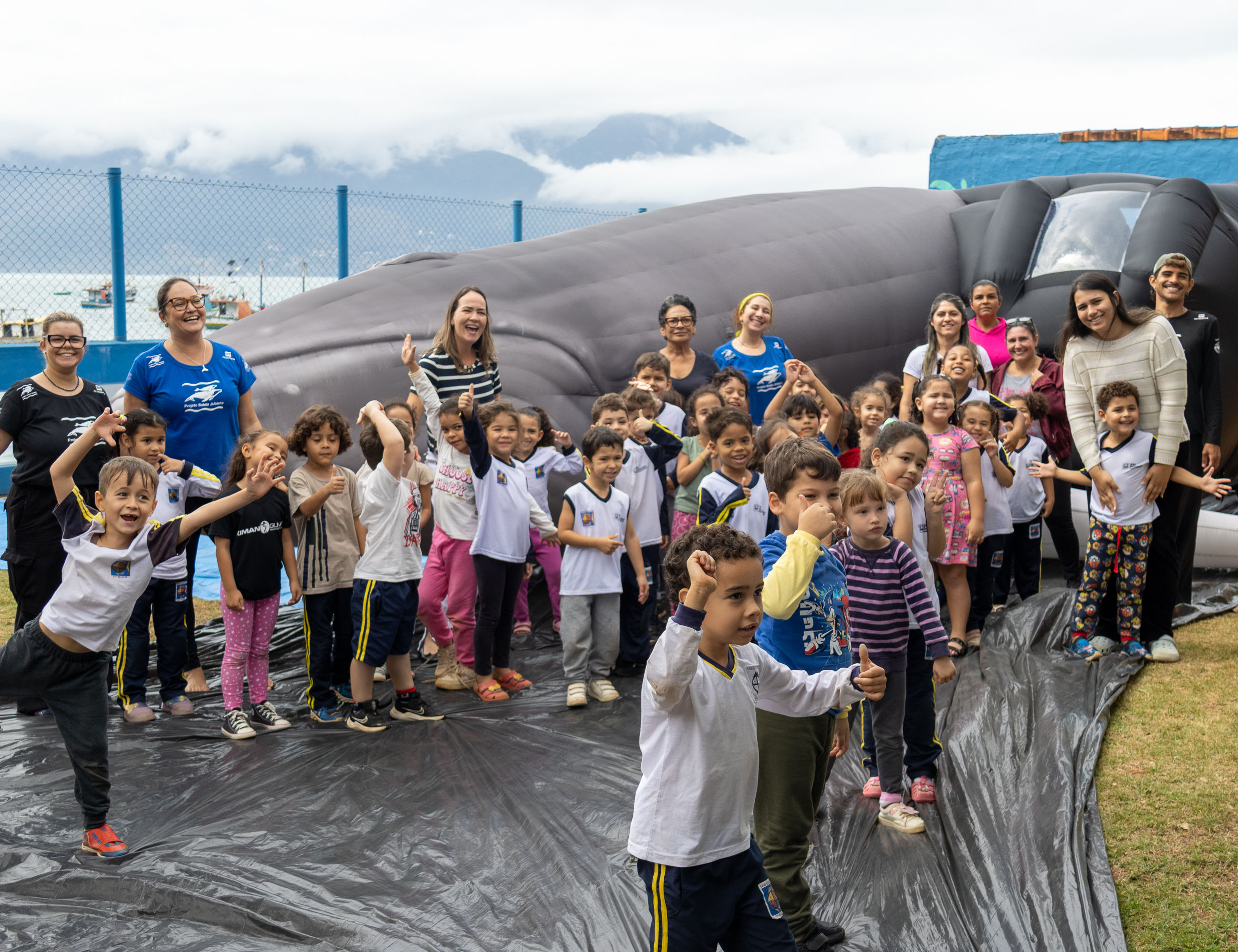 O destaque da programação foi a presença da baleia inflável do Projeto Baleia Jubarte, uma réplica de 14 metros que encantou os alunos ao possibilitar uma experiência imersiva e interativa. Além de entrar na baleia e explorar seus detalhes anatômicos, as crianças puderam observar de perto materiais biológicos, como barbatanas, olho de baleia jubarte, cracas e piolhos, que ajudaram a compreender melhor os hábitos, a alimentação e o papel ecológico da espécie.