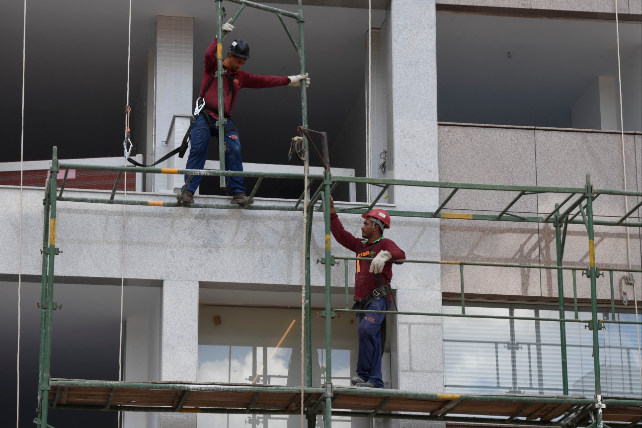 #PraTodosVerem: Trabalhadores da construção civil aparecem em diferentes momentos de atuação: em uma das cenas, um grupo de pessoas com capacetes amarelos, coletes e luvas pratica técnicas de alvenaria em um espaço demarcado, manuseando tijolos e ferramentas; em outra, dois operários com equipamentos de segurança, capacetes e cintos de proteção trabalham em um andaime montado na fachada de um prédio, demonstrando a rotina e os cuidados necessários em obras de diferentes escalas. Fim da descrição.