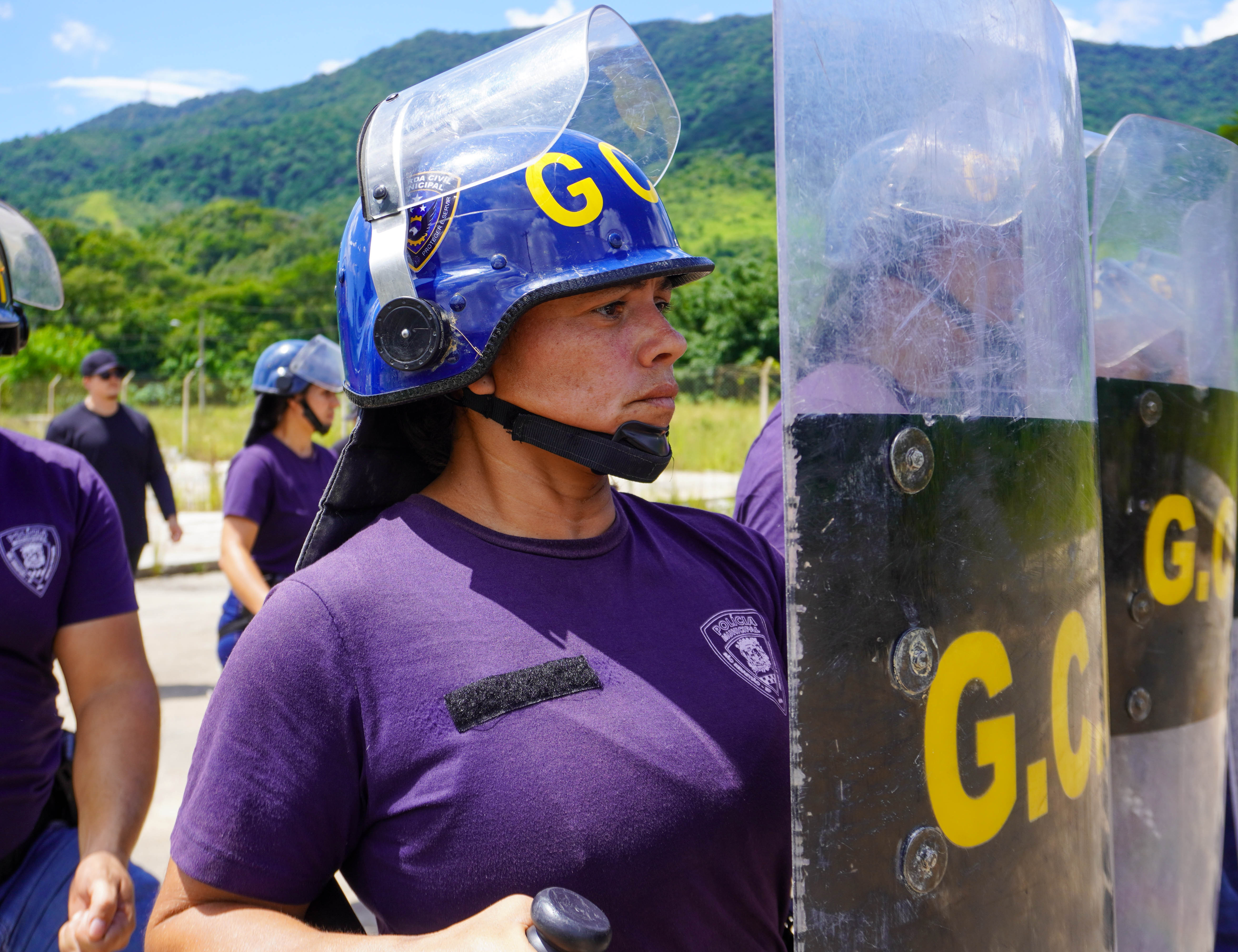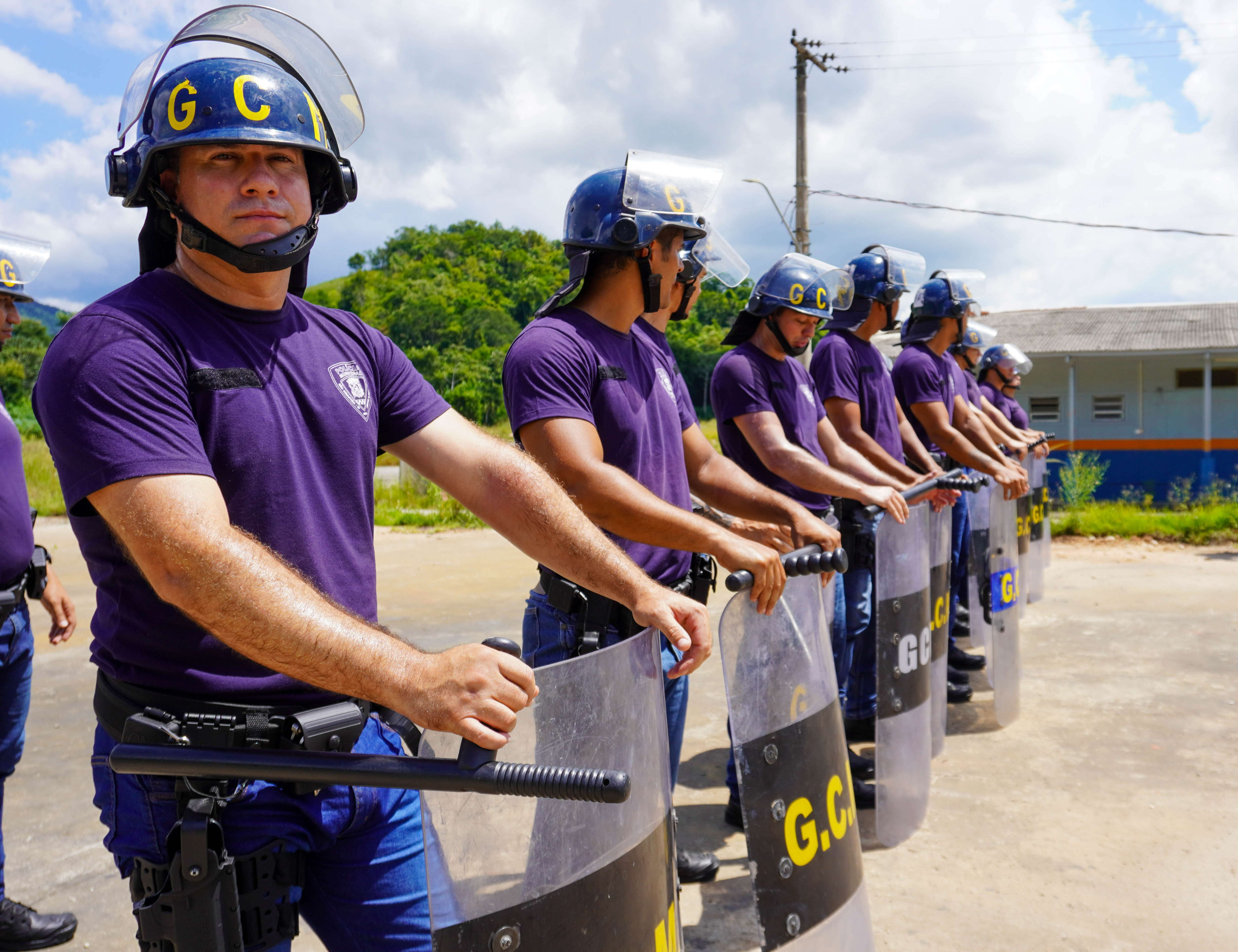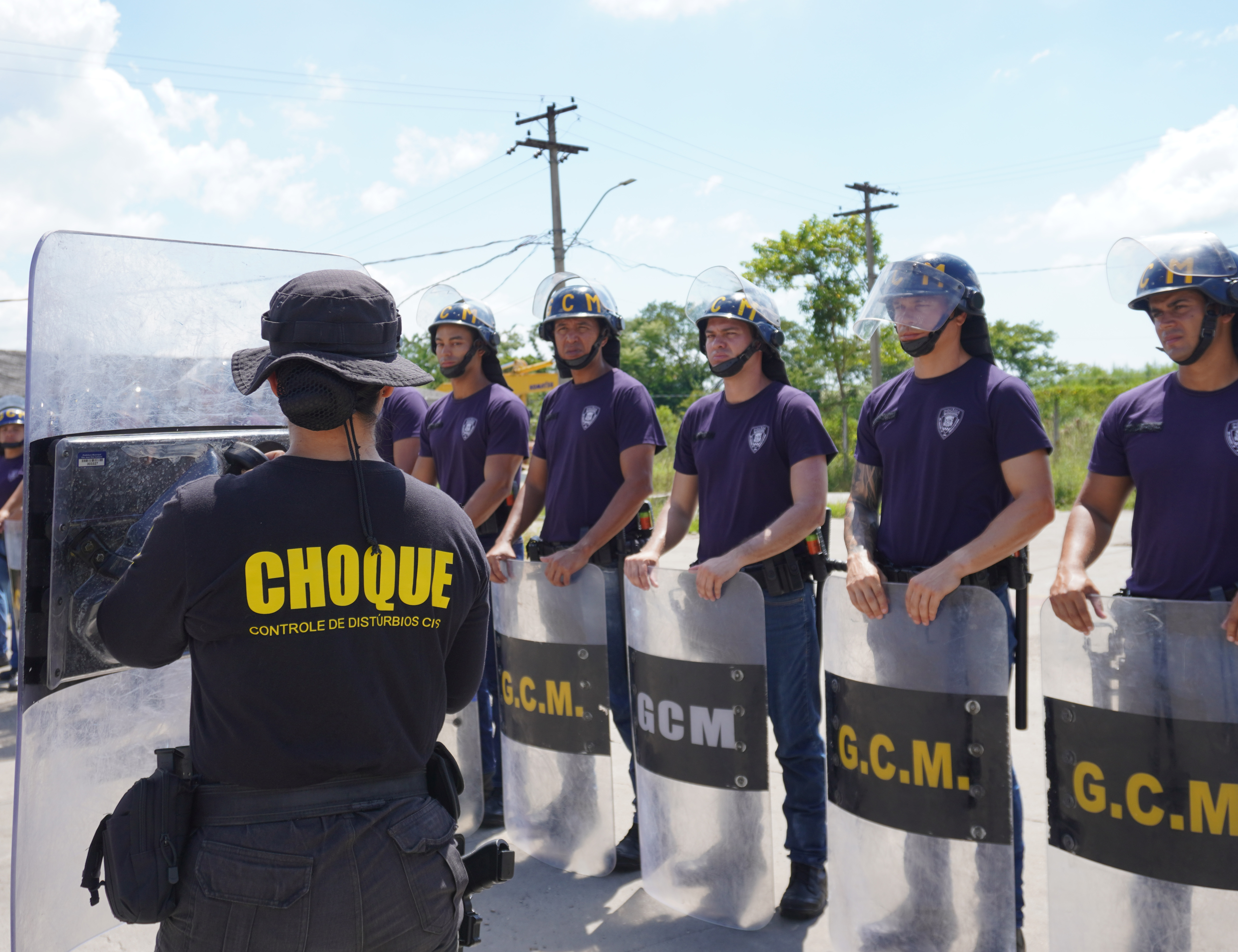 #PraTodosVerem: Conjunto de quatro fotografias registra o treinamento de controle de distúrbios civis da Guarda Civil Municipal. Os agentes, vestindo camisetas roxas com a inscrição "Aluno Polícia Municipal", calças jeans e cinturões táticos, aparecem em formação de linha e em posição de sentido em um pátio aberto sob sol forte. Eles utilizam equipamentos de proteção como capacetes azuis com viseiras e escudos antitumulto transparentes com a sigla "G.C.M.". Uma instrutora com a inscrição "CHOQUE" nas costas supervisiona a técnica dos alunos que seguram cassetetes e mantêm feições focadas diante de uma paisagem com montanhas e vegetação ao fundo. Fim da descrição.