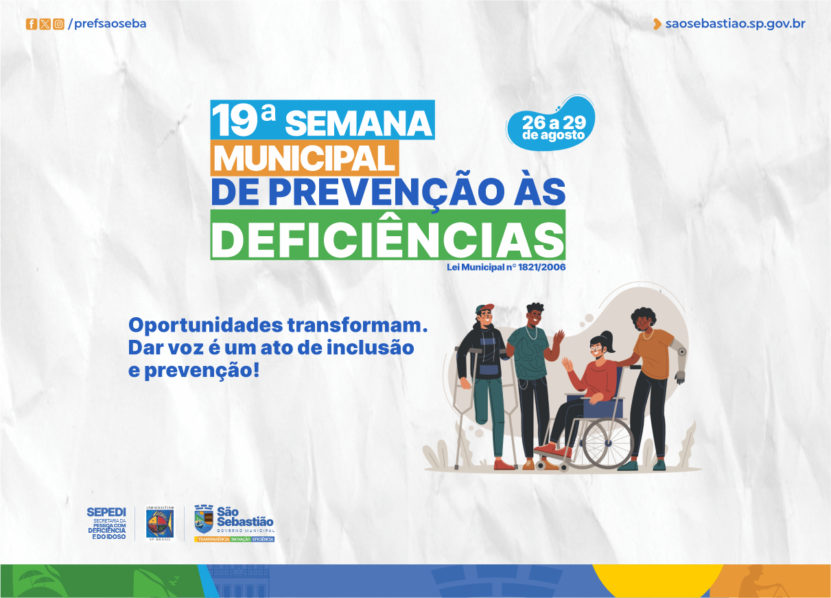 Em conformidade com a Lei Municipal nº 1.821/2006, que institui a Semana Municipal de Prevenção às Deficiências, a ser realizada anualmente no mês de agosto, a Prefeitura de São Sebastião, por meio das secretarias da Pessoa com Deficiência e do Idoso (Sepedi), Educação (Seduc), Esporte (Seesp), Saúde (Sesau), Desenvolvimento Econômico e Social (Sedes), Segurança Urbana (Segur), Serviços Públicos (Sesep) e Administração (Secad), além da Fundação de Arte e Cultura (Fundass), elaborou uma programação especial de 26 a 29 de agosto para desenvolver a 19ª Semana Municipal de Prevenção às Deficiências.