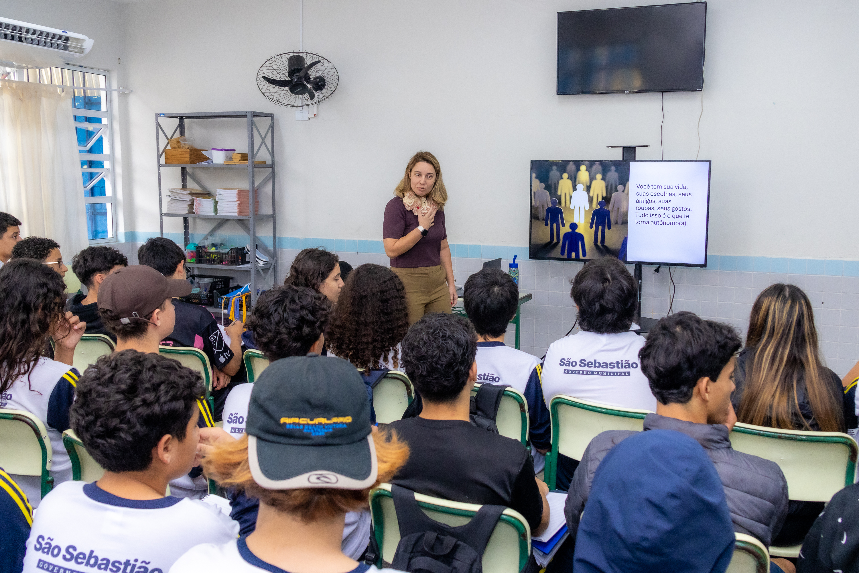 #PraTodosVerem: imagens mostram um grupo de estudantes uniformizados participando de uma atividade em sala de aula. Em uma das fotos, uma professora está em frente à turma, ao lado de uma televisão que exibe uma apresentação, enquanto os alunos assistem atentamente. Em outra, os estudantes aparecem sentados, escrevendo em seus cadernos e fazendo anotações. Na terceira e última imagem, além da professora, dois professores diferentes aparecem e fazem a explicação do conteúdo enquanto os alunos acompanham a apresentação. A sala está cheia, com alunos atentos e concentrados. Fim da descrição.