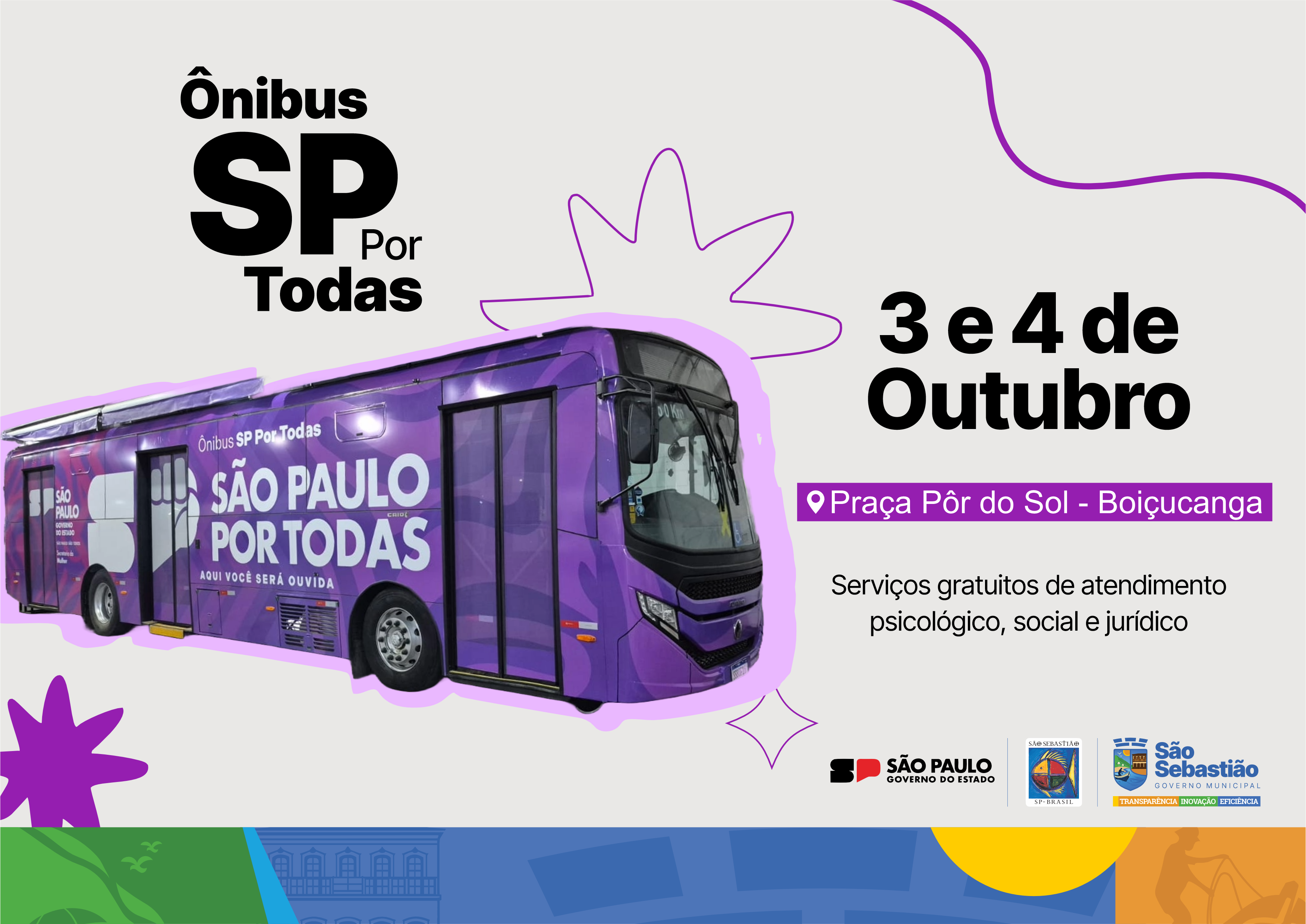 São Sebastião está na rota e será o destino do Ônibus SP Por Todas, nesta quinta (3/10) e sexta-feira (4/10). A iniciativa tem a missão de promover ações integradas de prevenção e enfrentamento da violência contra a mulher, atuando de forma itinerante para atender áreas de vulnerabilidade social. O ônibus estará na Praça Pôr do Sol, no bairro de Boiçucanga, das 10h às 13h e das 14h às 17h.