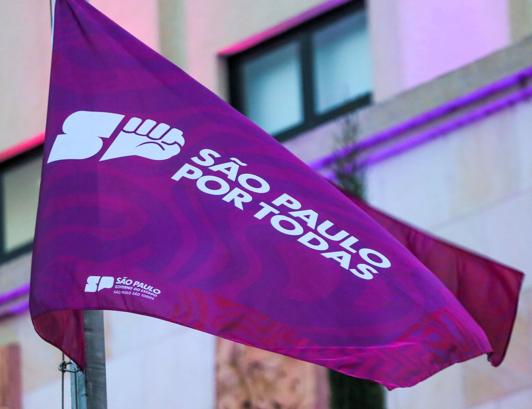 #PraTodosVerem: As imagens mostram o projeto Ônibus SP Por Todas, iniciativa do Governo do Estado de São Paulo voltada ao atendimento e acolhimento de mulheres, com destaque para a bandeira roxa estampada com o símbolo do programa e para o ônibus caracterizado com a identidade visual da campanha, exibindo frases como “Aqui você será ouvida”, reforçando a mensagem de escuta, respeito e valorização da mulher. Fim da descrição.