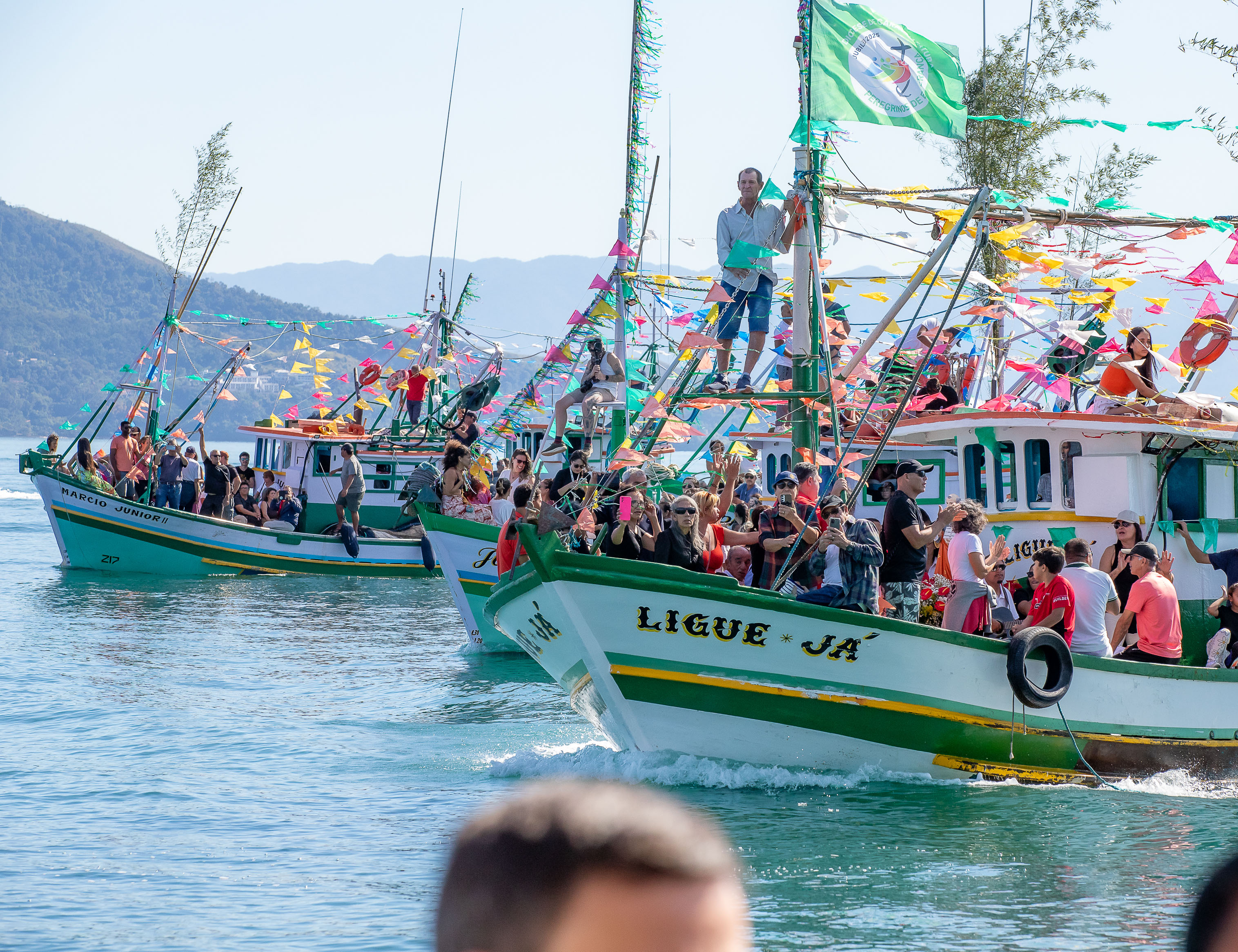 #PraTodosVerem: Vista aérea de várias embarcações enfeitadas navegando juntas em procissão pelo mar, em um dia ensolarado. Ao fundo, uma serra coberta por vegetação e o oceano. Fim da descrição.