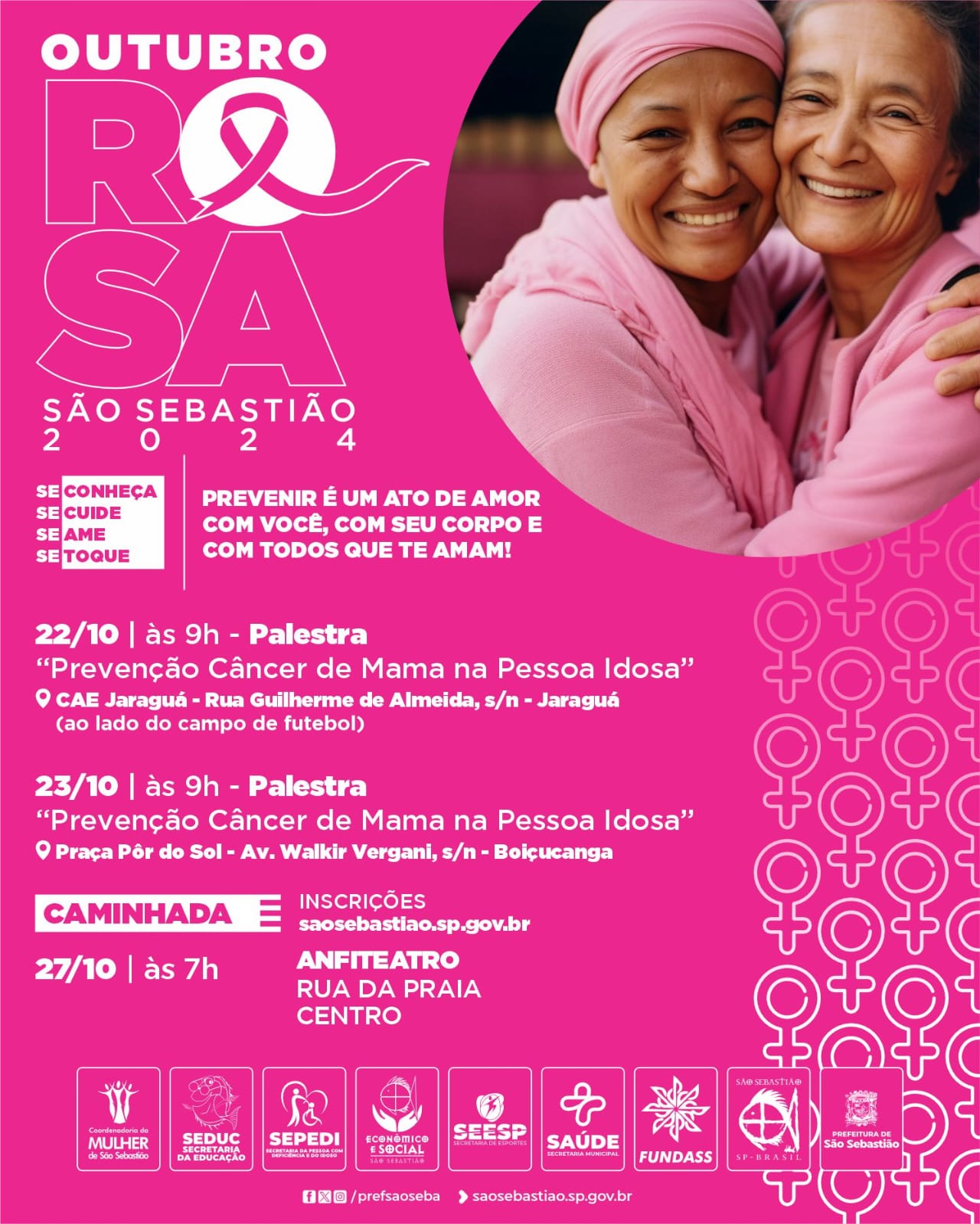 Em meio a programação do Outubro Rosa, a Prefeitura de São Sebastião, por meio da Secretaria da Pessoa com Deficiência e do Idoso (SEPEDI), da Secretaria de Saúde (SESAU) e do Fundo Social de Solidariedade, promoverá palestras especiais voltadas à importância da prevenção do câncer de mama na pessoa idosa.