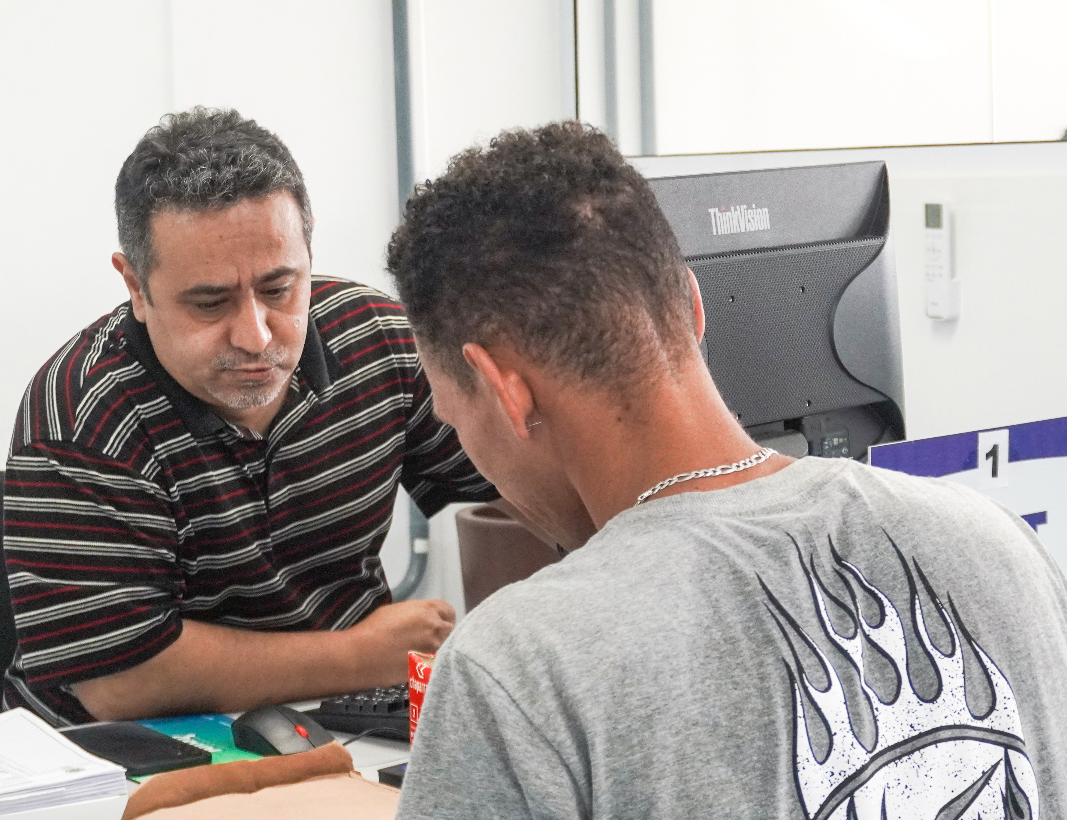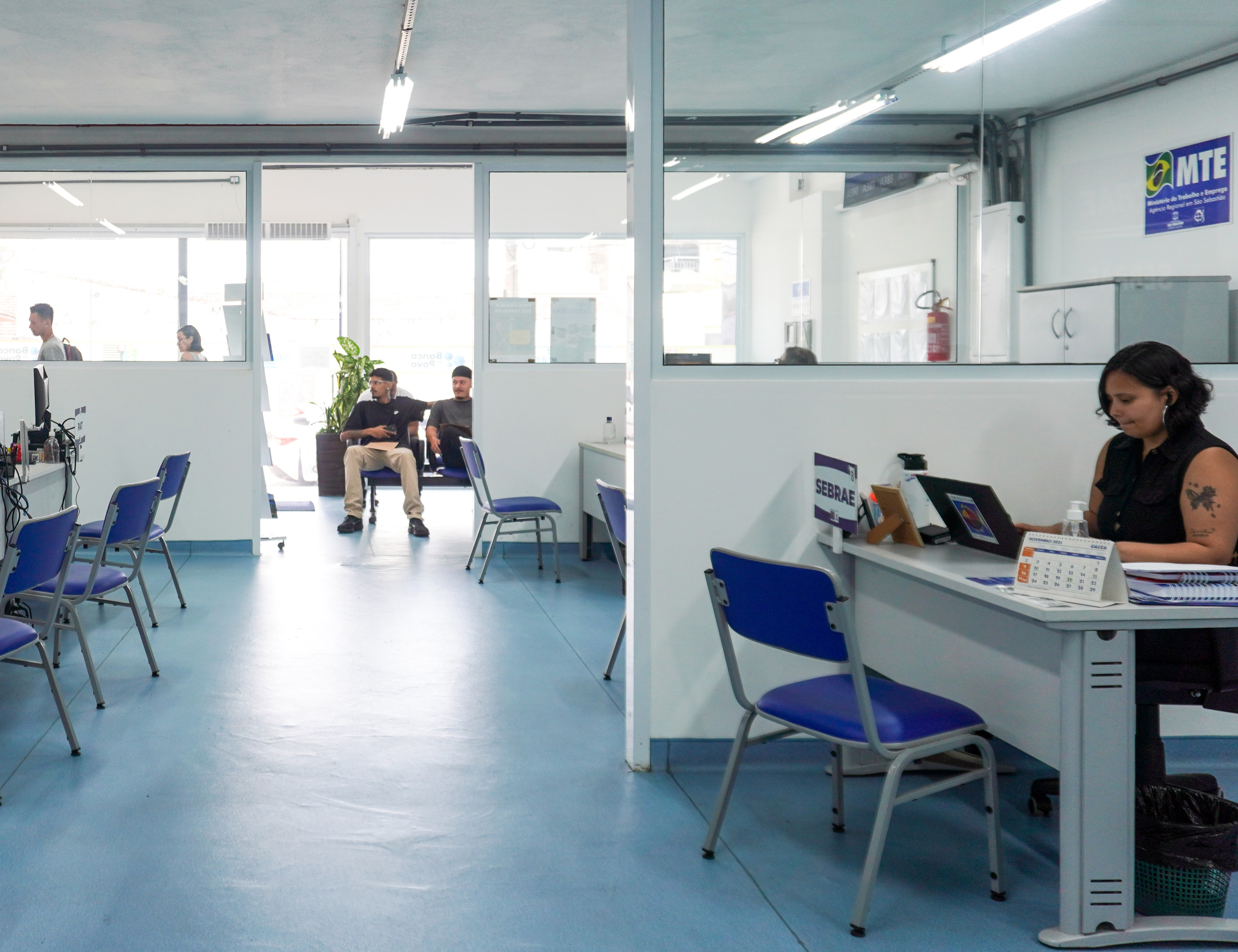 #PraTodosVerem: As imagens ilustram diferentes etapas e ferramentas de apoio ao contribuinte, começando pela sede da Secretaria de Desenvolvimento Econômico e Social (Sedes), em um ambiente de um amplo escritório de serviços públicos com divisórias de vidro, piso azul e guichês identificados com sinalizações do Sebrae, PAT e MTE. Nesse local, profissionais trabalham em computadores e atendem ao público, o que é detalhado em uma cena de interação direta onde um atendente com camisa listrada presta auxílio a um jovem em frente a um monitor. Complementando esse suporte presencial, a dimensão digital é representada por um smartphone posicionado sobre um teclado de computador, exibindo na tela o aplicativo da Receita Federal com o título "Meu Imposto de Renda". Fim da descrição.