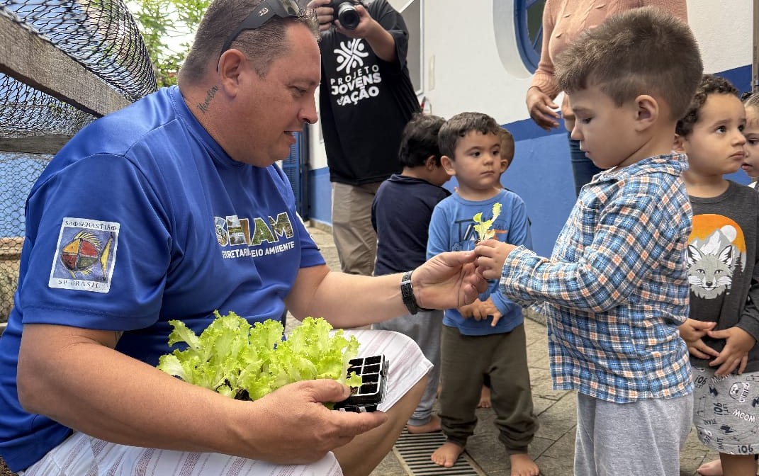 A ação contou com a participação de 15 alunos e professores, que trabalharam no plantio de 40 mudas de alface, na horta da Creche Municipal de Barqueçaba, na Costa Sul do município.