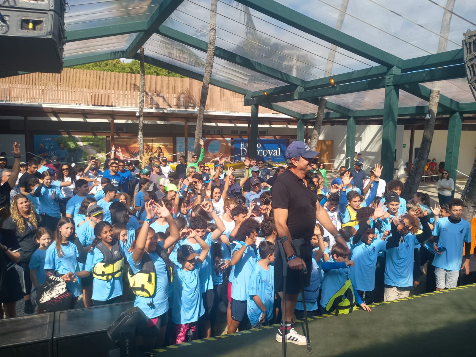 #PraTodosVerem: durante o evento Vela do Amanhã, crianças e adolescentes de São Sebastião aparecem reunidos com camisetas azuis em momento de confraternização e integração com atletas e instrutores; ao fundo, banners e estrutura coberta completam o cenário. Em outro registro, os jovens velejadores posam orgulhosos no palco de premiação, exibindo suas medalhas ao lado de autoridades e representantes da organização, diante de um telão colorido e com vista para a marina. As imagens destacam a alegria, o espírito esportivo e a valorização da vivência náutica. Fim da descrição.