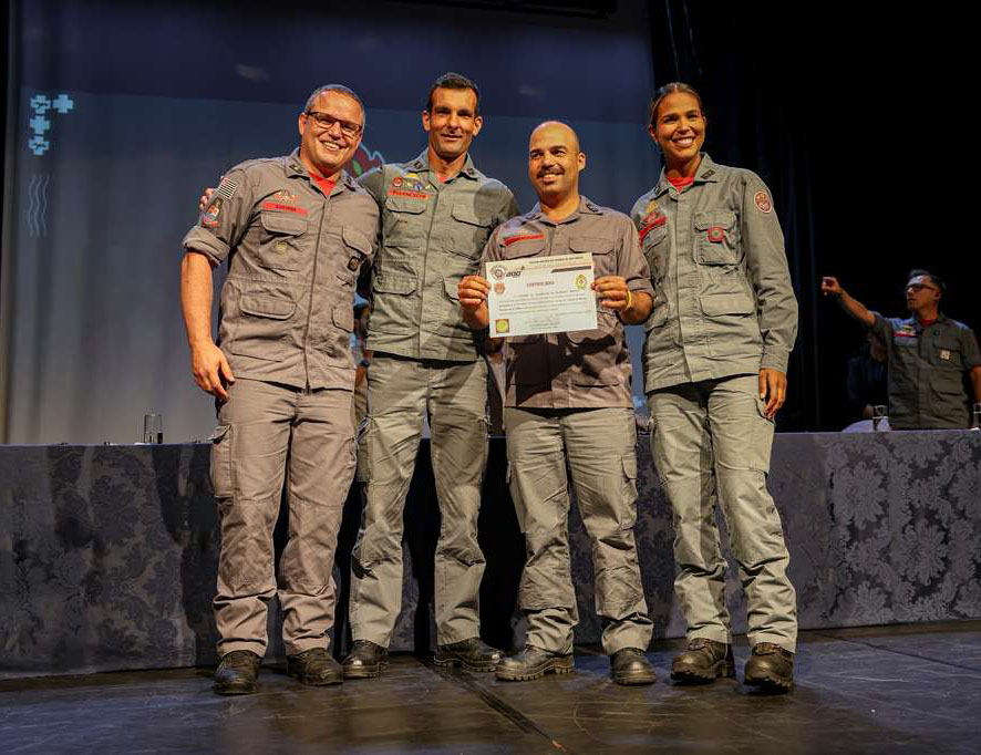#PraTodosVerem: As imagens mostram uma cerimônia de formatura e entrega de certificados a integrantes do Corpo de Bombeiros. Em um auditório iluminado, bombeiros fardados posam para fotos e recebem cumprimentos. Em uma das fotos, um bombeiro sorri e aperta a mão de um colega; em outra, o grupo inteiro de formandos posa em frente ao palco com bandeiras ao fundo. Também há registros de bombeiros acompanhados de familiares, inclusive crianças segurando certificados, e de grupos menores sendo diplomados e fotografados juntos no palco. Fim da descrição.