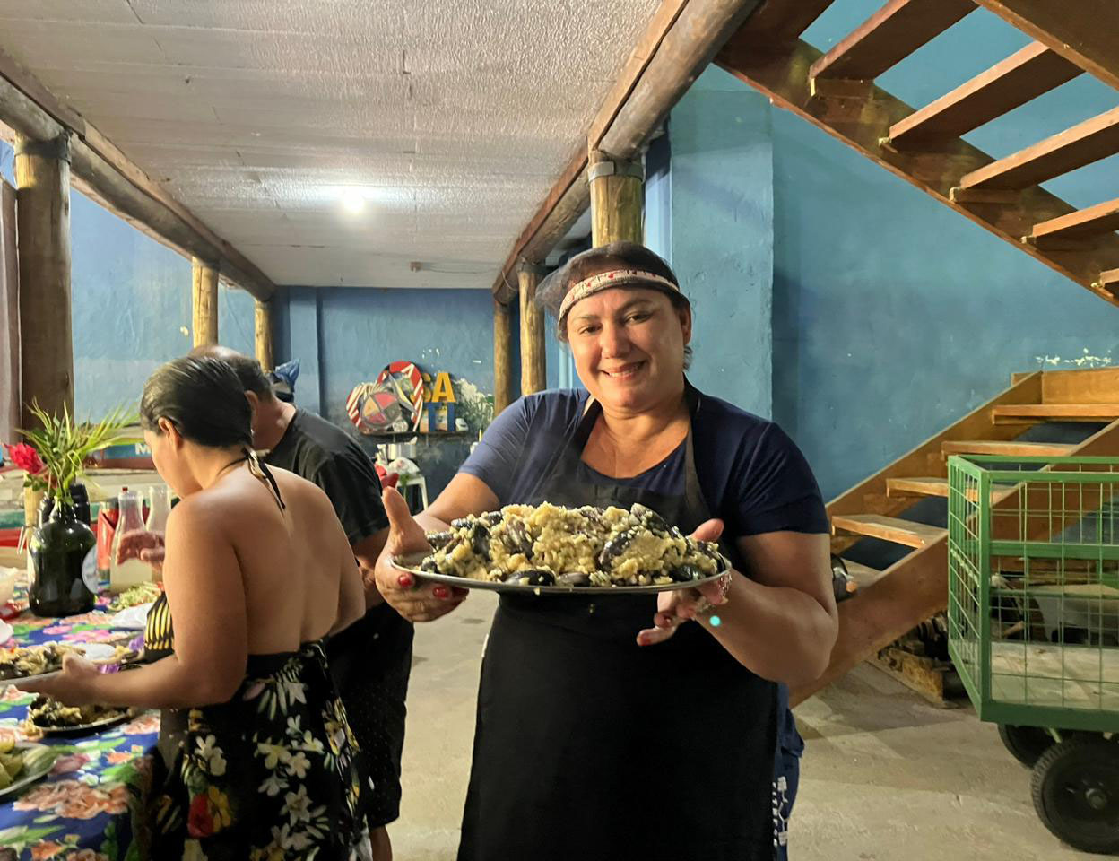 #PraTodosVerem: As fotos mostram um almoço comunitário realizado em um salão com paredes azuis e estrutura de madeira, decorado com flores tropicais sobre uma mesa coberta por toalha colorida. Na primeira imagem, uma mulher sorri segurando um grande prato de mexilhões preparados, vestindo avental preto e uma faixa na cabeça. Na segunda, várias pessoas se servem na mesa, pegando pratos e alimentos em clima descontraído. Na terceira imagem, um grupo de homens e mulheres posa sorridente em frente à mesa, ao fundo um banner da Associação dos Pescadores de Boicucanga destaca a valorização da tradição caiçara. Fim da descrição.