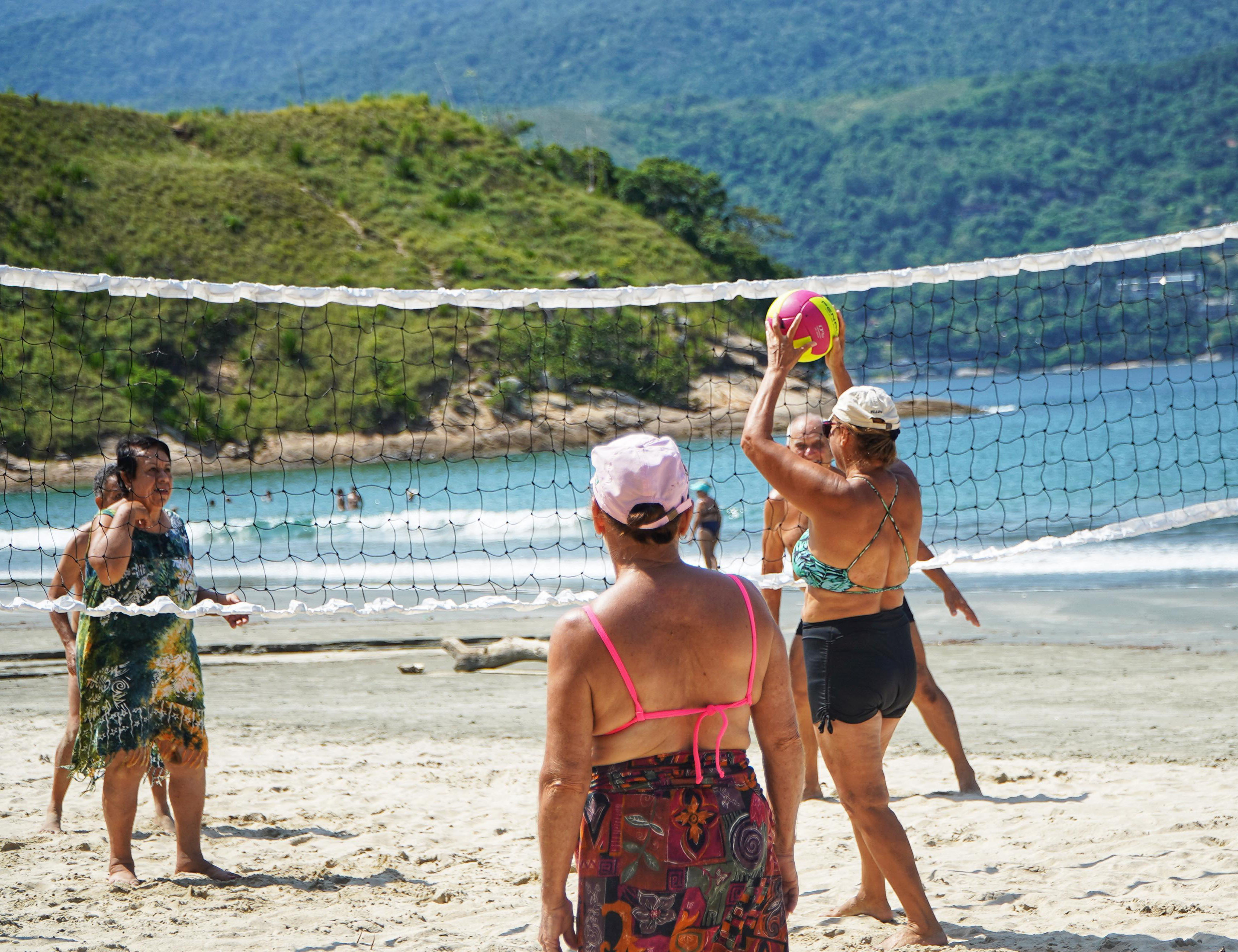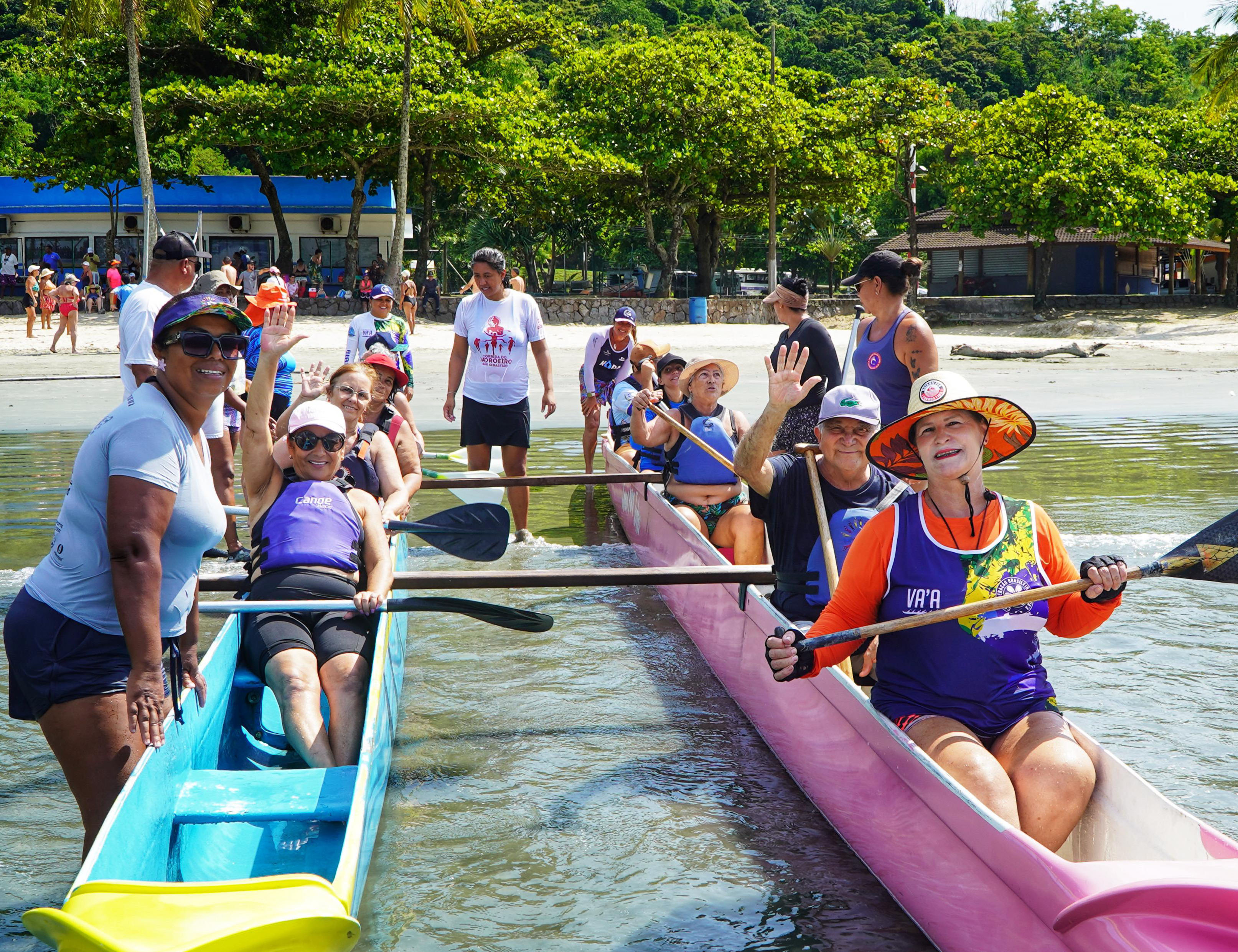 #PraTodosVerem: imagens de um grupo de mulheres idosas reunidas em duas canoas para prática da atividade no mar com auxilio de instrutores, outra imagem de um grupo de mulheres praticando atividade física na areai, ao ar livre sob o comando de um professor, mais uma imagem de mulheres idosas praticando o vôlei de praia e a última imagem retrata duas mulheres uma sentada num caiaque praticando a modalidade com o auxílio de uma outra mulher que se encontra atrás do caiaque. Fim da descrição.