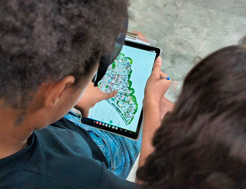 #PraTodosVerem: Sequência de imagens mostra um momento de formação e trabalho técnico com jovens monitores. Nas duas primeiras imagens, mãos de participantes seguram um tablet que exibe um mapa aéreo detalhado de um bairro, com ruas e casas vistas de cima; uma das pessoas aponta para a tela enquanto outra segura documentos impressos ao lado, indicando análise e conferência de informações territoriais. Na terceira imagem, um grupo de jovens e adultos está reunido em uma sala simples, com cadeiras brancas dispostas em semicírculo; alguns estão sentados com pranchetas e tablets, enquanto uma facilitadora em pé orienta a atividade. O ambiente tem paredes claras, um mural colorido ao fundo e clima de atenção e aprendizado coletivo.