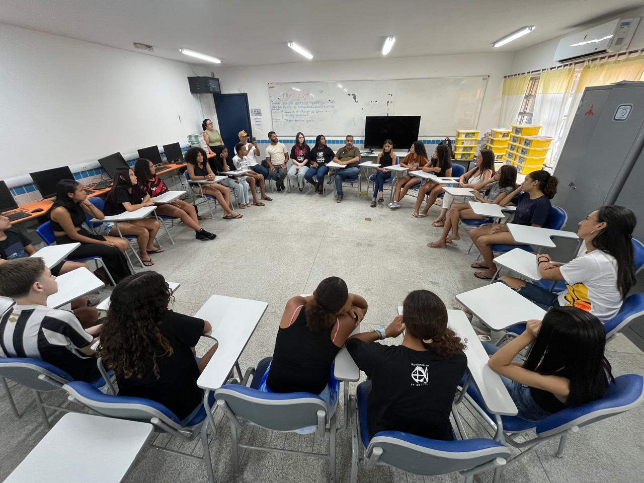 #PraTodosVerem: fotos mostram rodas de conversa realizadas com estudantes da rede municipal em suas escolas. Fim da descrição.