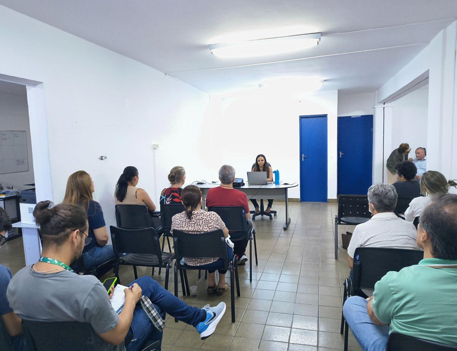 #PraTodosVerem: Representantes do Comus estão sentados em cadeiras espalhadas por uma sala tendo à frente uma mulher que conduz a reunião. Fim da descrição.