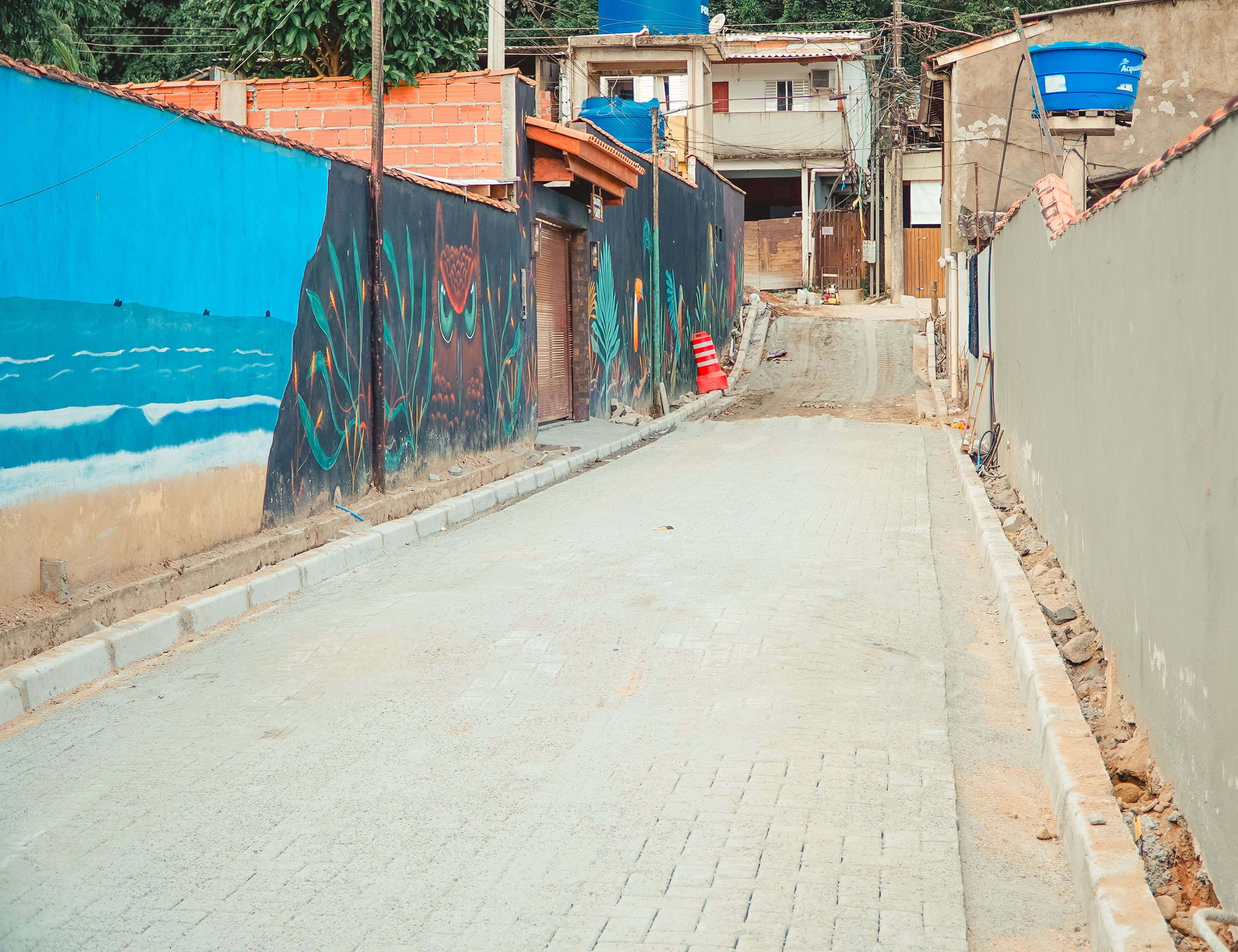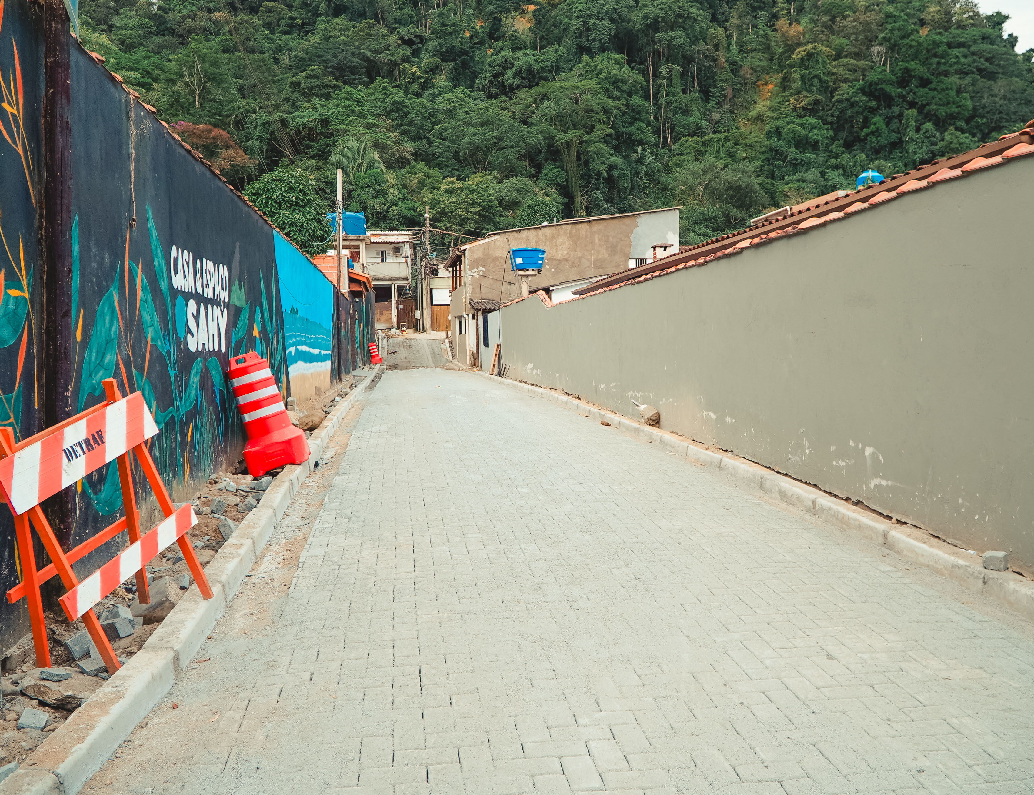 #PraTodosVerem: As imagens mostram as ruas sendo pavimentadas. Logo é possível ver quatro homens fazendo o serviço braçal. Na foto seguinte a rua sendo concluída, com os cones encostados na parede, pintada e com desenhos de pássaros, coruja e o mar, os cones ajudam na sinalização do serviço. No fundo da foto é possível ver a vegetação da mata atlântica. Fim da descrição.