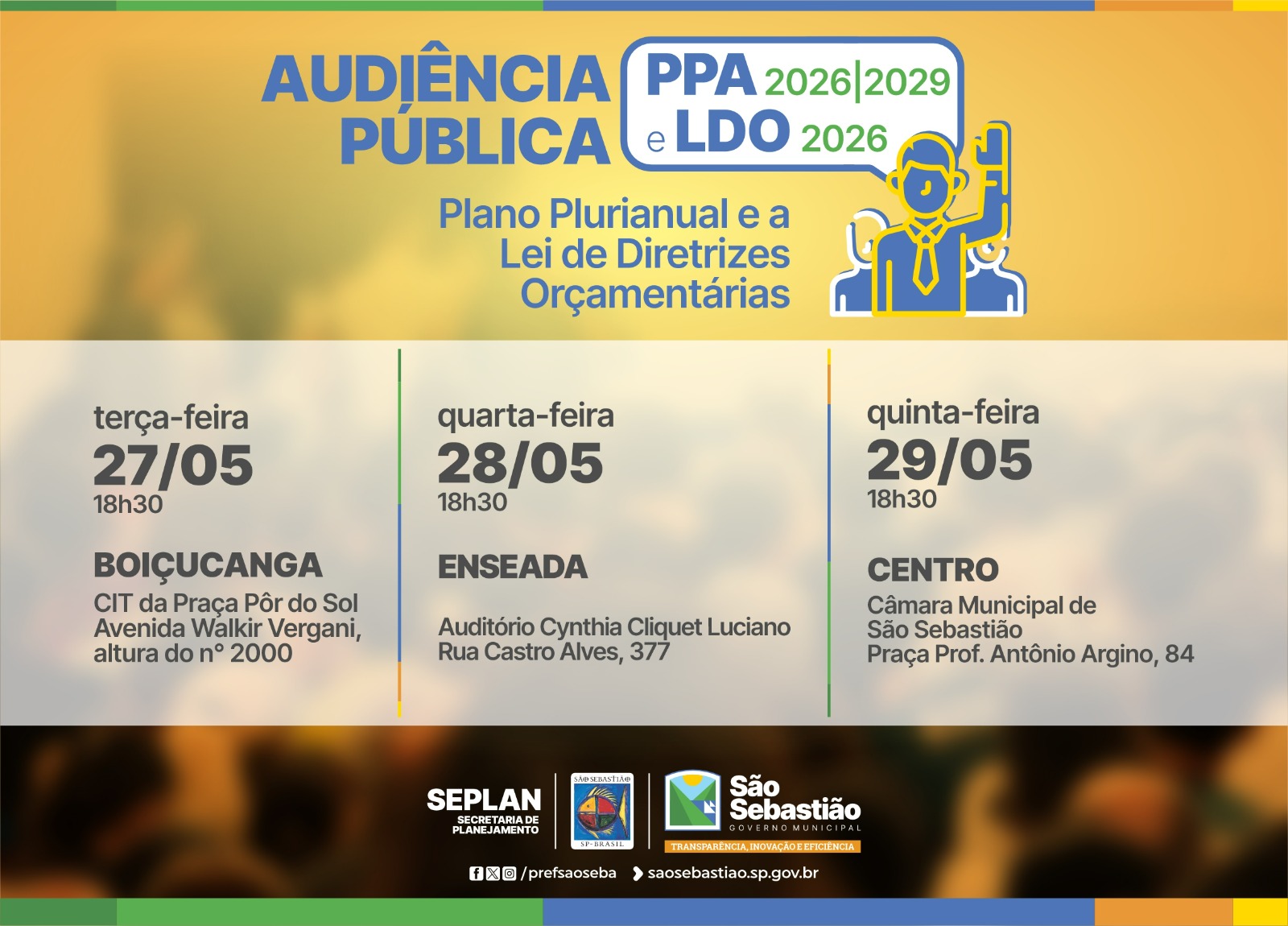 A Prefeitura de São Sebastião, por meio da Secretaria de Planejamento (Seplan), realiza entre os dias 27 e 29 de maio, sempre às 18h30, as Audiências Públicas para a elaboração do Plano Plurianual (PPA) 2026–2029 e da Lei de Diretrizes Orçamentárias (LDO) 2026. Os encontros presenciais ocorrerão em diferentes regiões do município: no dia 27 de maio, no Centro de Informações Turísticas (CIT) da Praça Pôr do Sol, em Boiçucanga; no dia 28 de maio, no Auditório Cynthia Cliquet Luciano, na Enseada; e no dia 29 de maio, na Câmara Municipal, no Centro.