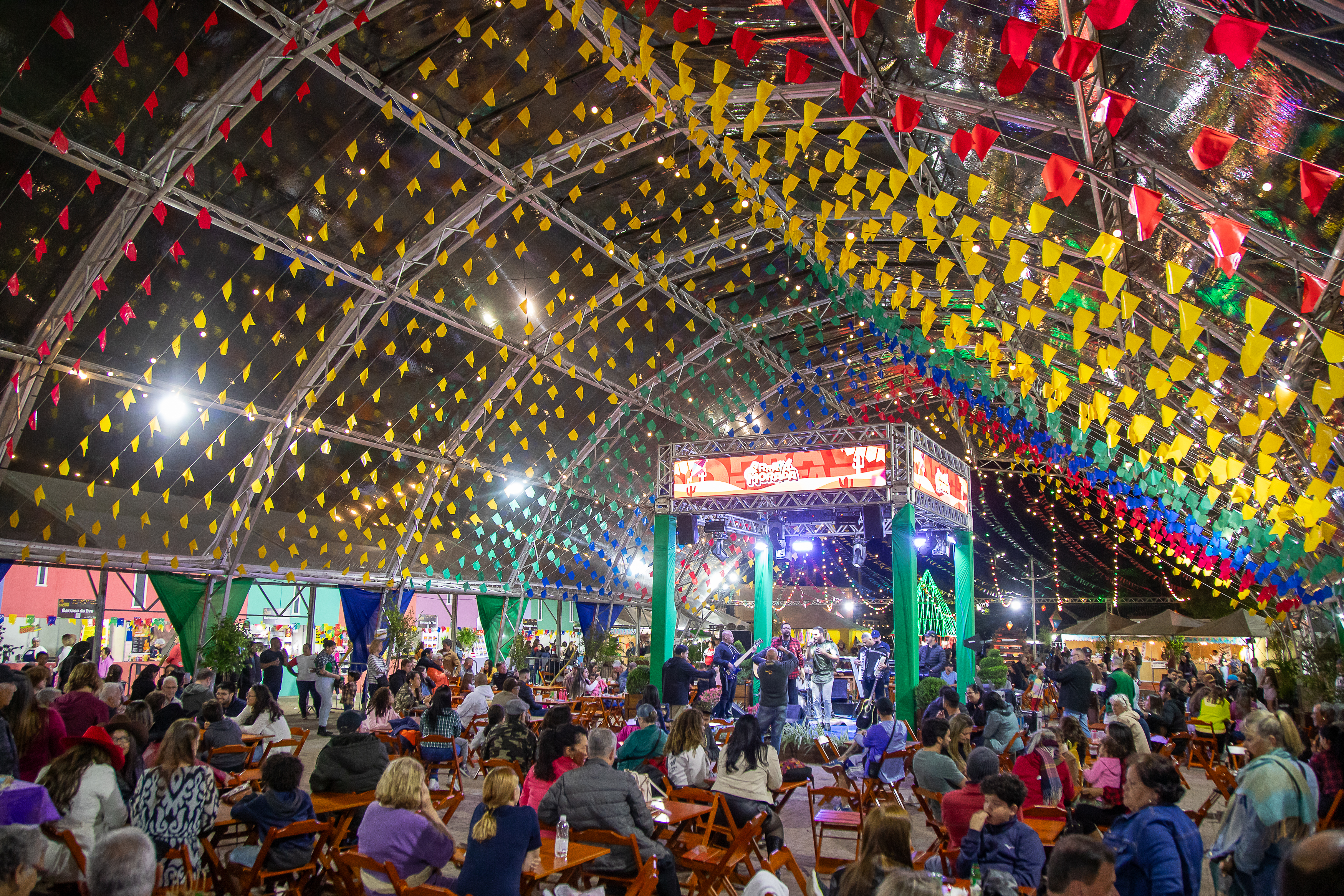 #PraTodosVerem: imagens do Arraiá Caiçara 2025, estrutura com tenda transparente, mesas, bandeiras juninas penduradas, e muitas pessoas sentadas; imagem da dupla Benziê no palco; imagem de um bolinho caipira. Fim da descrição.