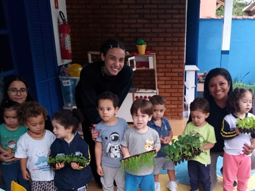 Na creche, participaram do plantio 23 alunos de um a quatro anos, uma professora, uma coordenadora escolar e um servidor da Semam como apoio. Foram plantadas 80 mudas de diversas hortaliças, como salsinha, alface, cebolinha e couve.