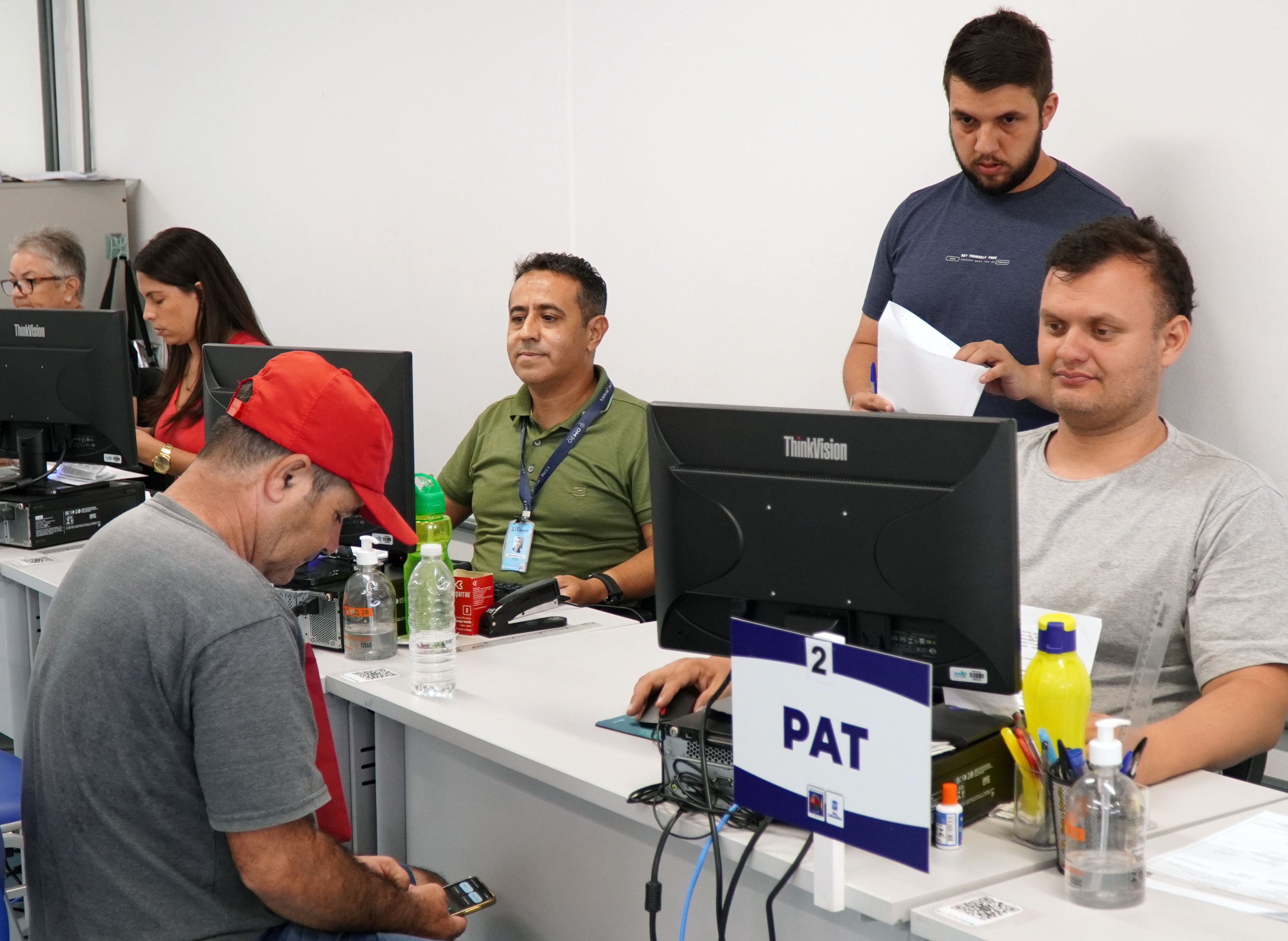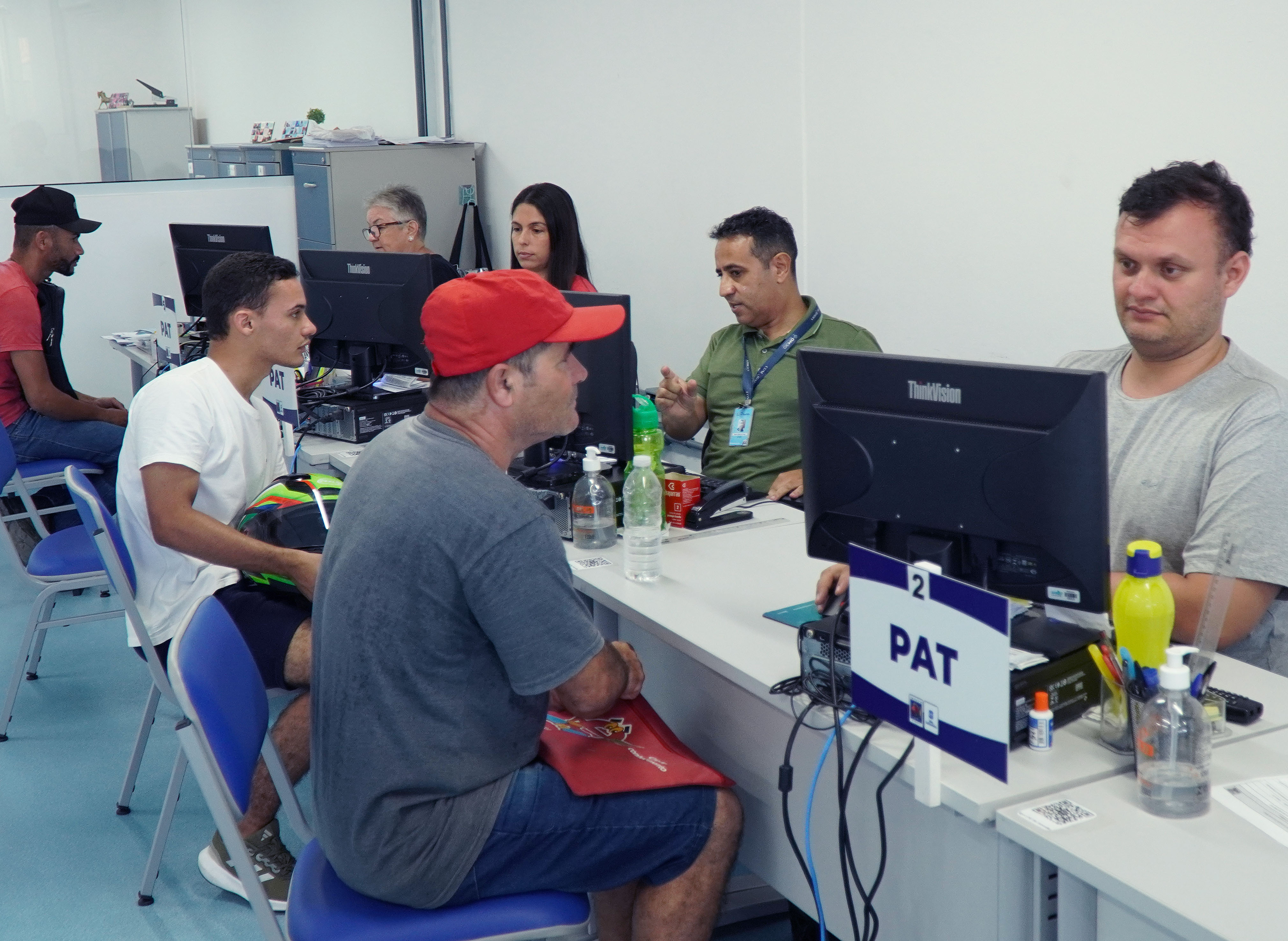 #ParaTodosVerem: As imagens registram momentos relacionados ao atendimento e encaminhamento para vagas de emprego em São Sebastião. Elas mostram pessoas sendo atendidas no Posto de Atendimento ao Trabalhador (PAT), onde funcionários auxiliam candidatos em busca de oportunidades no mercado, reforçando o papel do serviço público na geração de emprego e renda para a população. Fim da descrição.