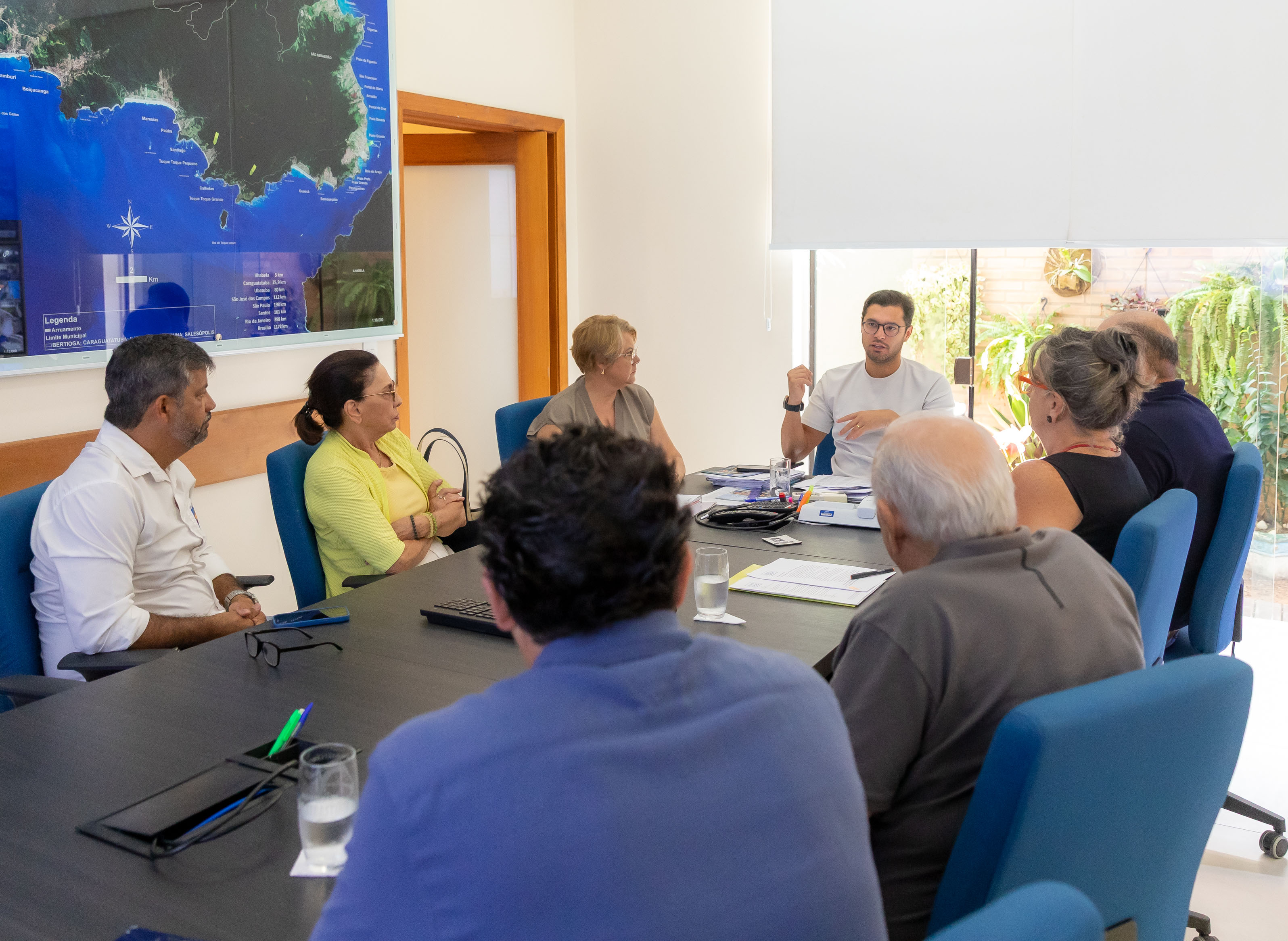 #PraTodosVerem: Nas imagens, o prefeito de São Sebastião, Reinaldinho Moreira, conduz uma reunião com representantes da Associação Amigos de Barequeçaba (Sabare), em que foram discutidas reivindicações dos moradores do bairro da região central do município. O encontro aconteceu em sala institucional, com mapas e telas de monitoramento ao fundo, reunindo lideranças locais em um ambiente formal de diálogo e cooperação. Fim da descrição.