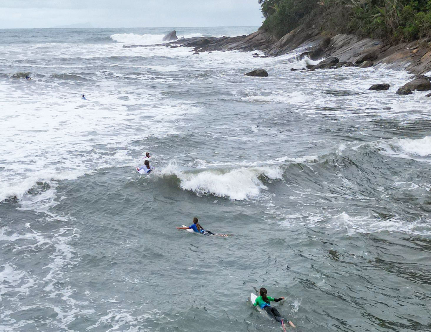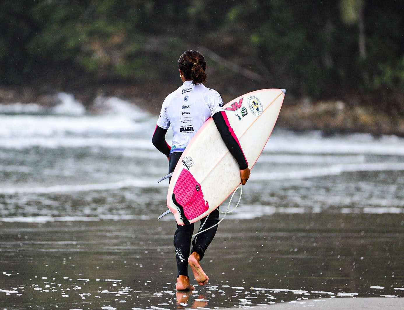 #PraTodosVerem: Surfistas se preparam e encaram as ondas durante o Circuito Sebastianense de Surf, realizado em uma praia de águas agitadas e cercada por vegetação nativa. As imagens mostram atletas entrando no mar com suas pranchas coloridas, demonstrando concentração e espírito esportivo em meio ao clima nublado e ao cenário natural do litoral de São Sebastião. Fim da descrição.