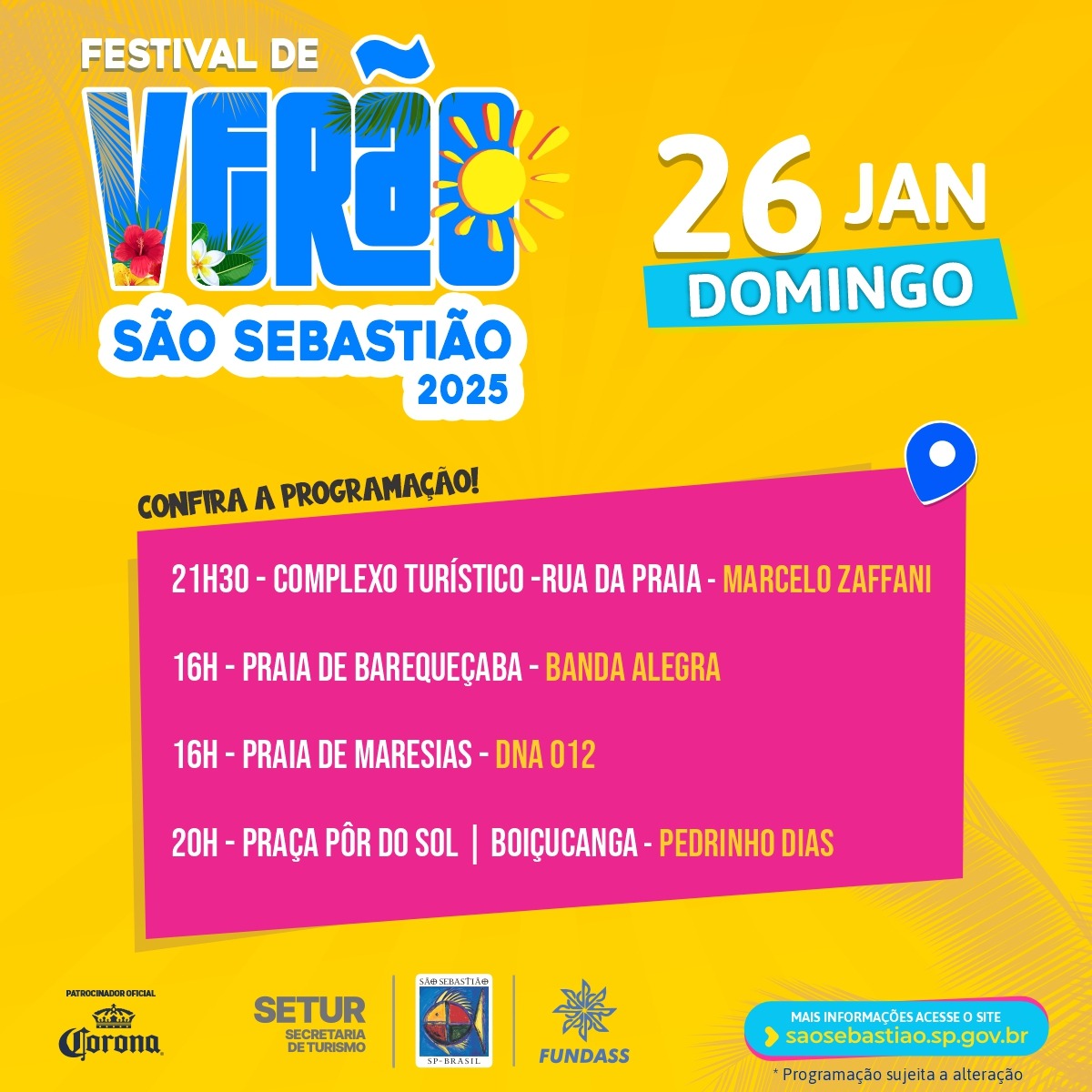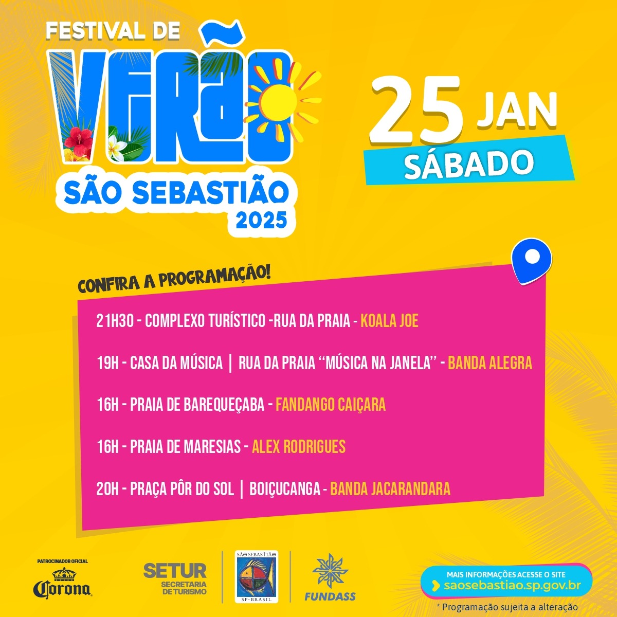 A Prefeitura de São Sebastião, por meio da Secretaria de Turismo (SETUR) e da Fundação Educacional e Cultural ‘Deodato Sant’Anna’ (Fundass), com patrocínio da Corona, segue com o Festival de Verão de São Sebastião 2025.