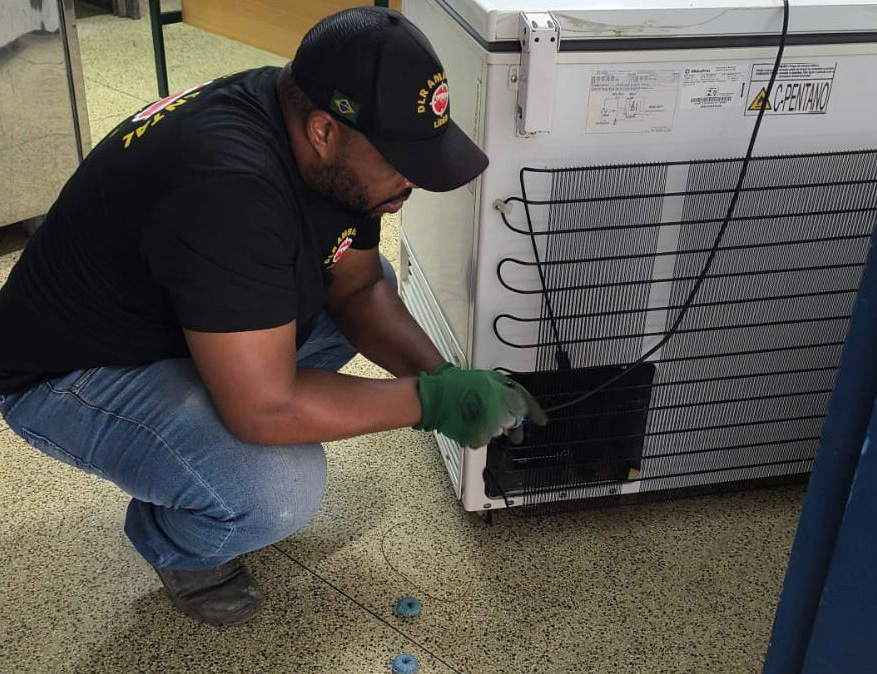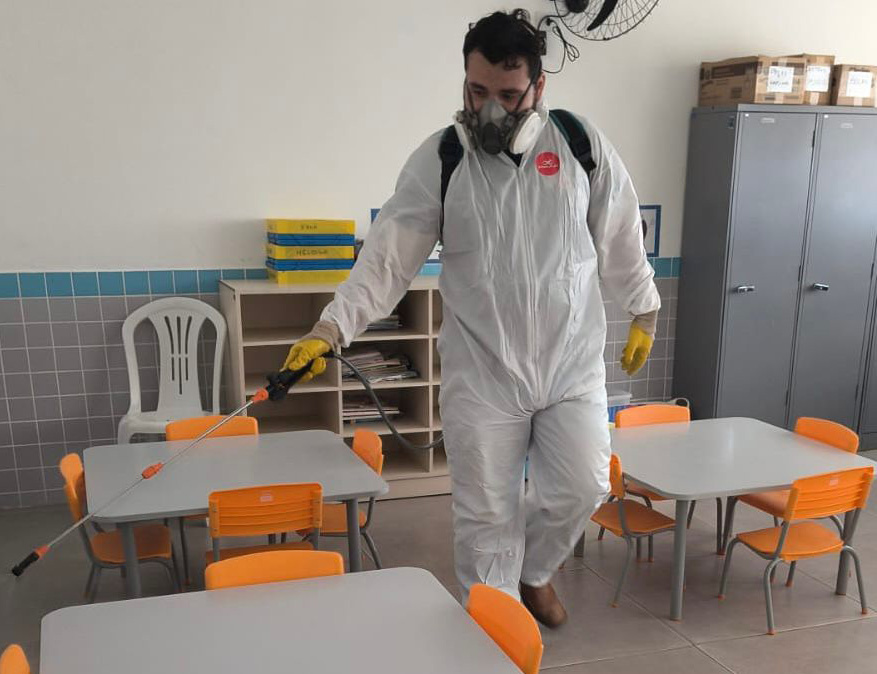 #PraTodosVerem: Sequência de quatro fotos de um serviço de dedetização escolar. Em três registros, um técnico com macacão de proteção branco, máscara e luvas utiliza um pulverizador costal para aplicar inseticida em salas de aula com cadeiras coloridas e áreas externas. Na outra imagem, um homem de camiseta preta e boné trabalha agachado na parte traseira de um freezer branco. Fim da descrição.