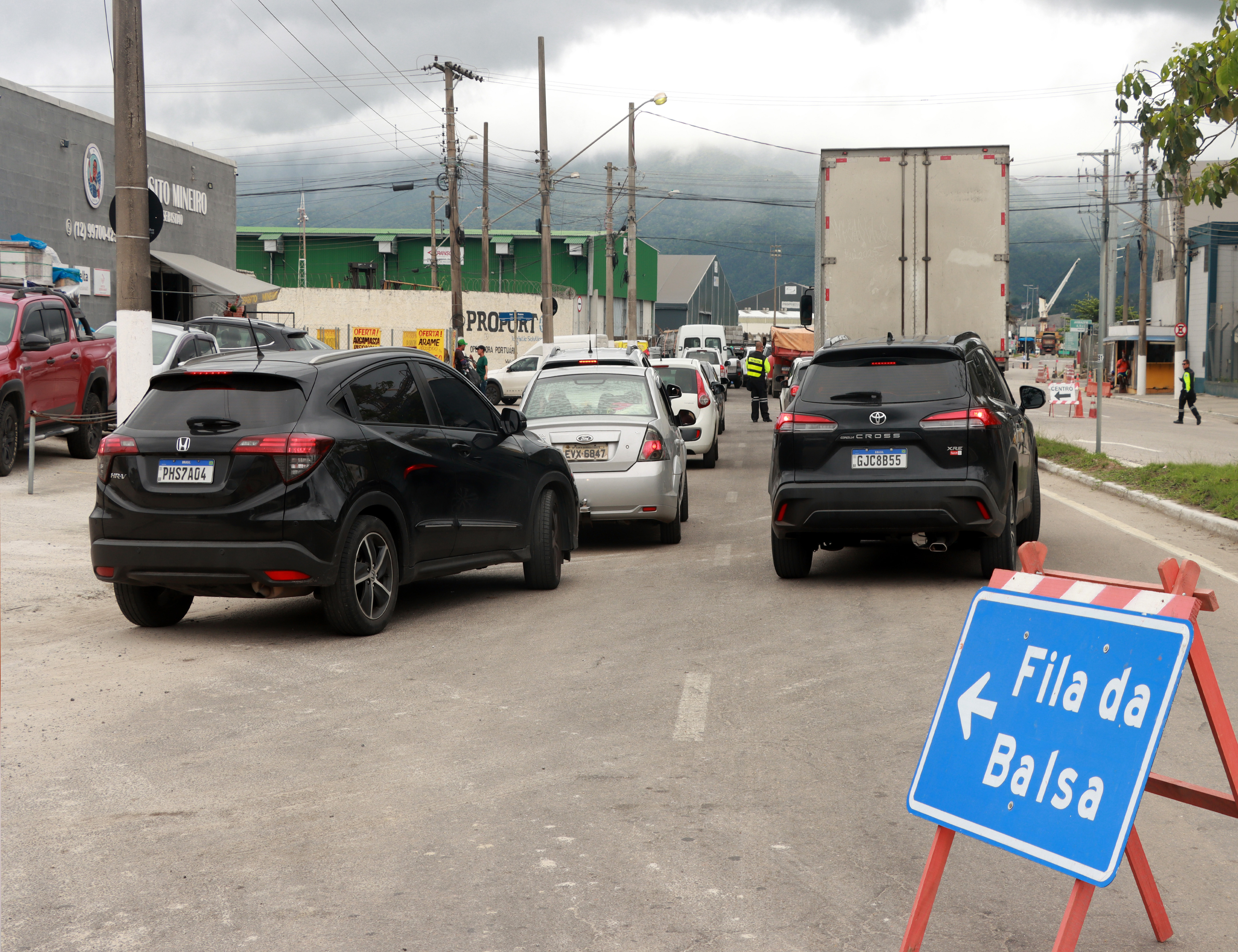#PraTodosVerem: As imagens registram o trânsito carregado em uma zona portuária sob céu nublado, destacando o fluxo de veículos para a travessia da balsa. Veem-se filas de carros, caminhões de carga pesada e sinalizações de trânsito, como cones, barris laranjas e uma placa azul indicando "Fila da Balsa". O cenário inclui galpões industriais, um silo e trabalhadores orientando os motoristas em meio ao congestionamento urbano e portuário. Fim da descrição.
